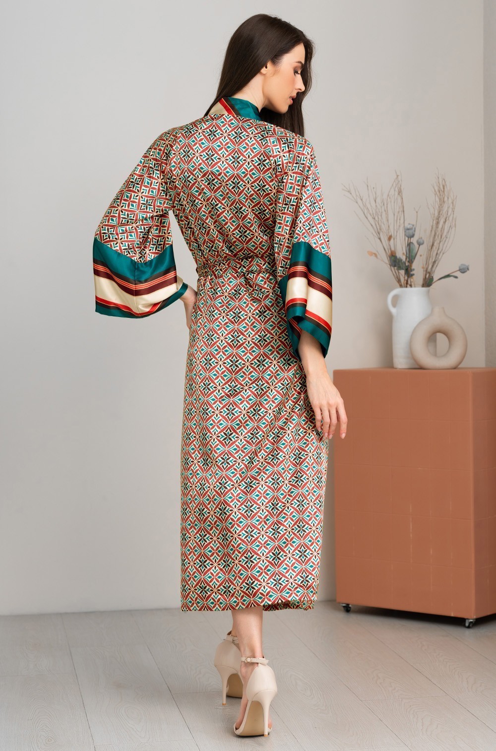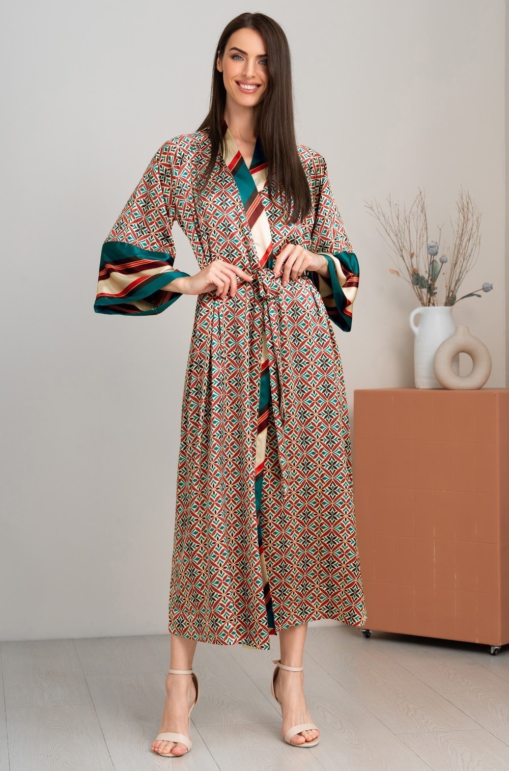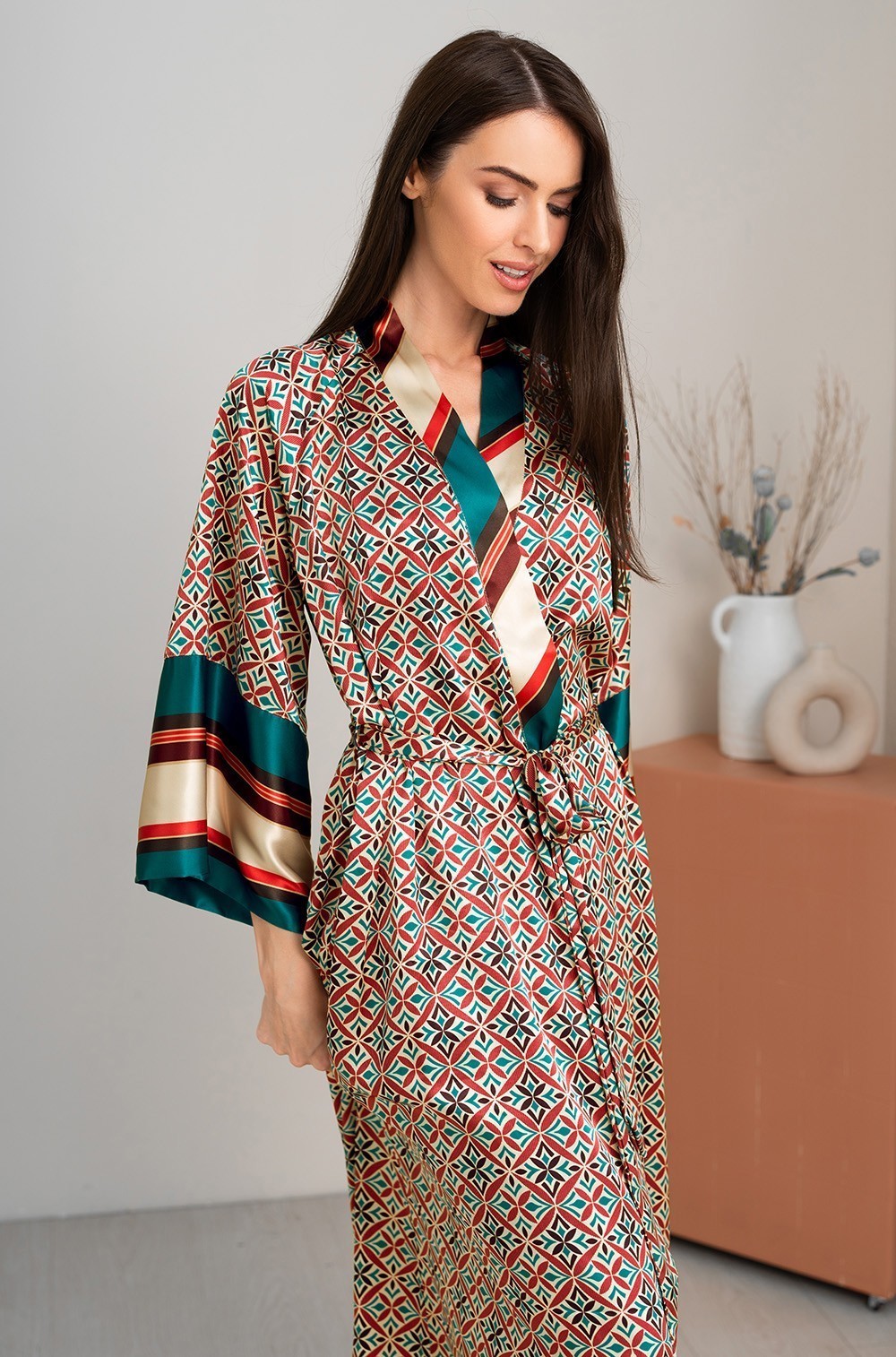Длинный запашной халат Mia-Amore с широким длинным рукавом. Изделие выполнено из разных сочетаний принтованного смесового шелка. По бокам расположены карманы.