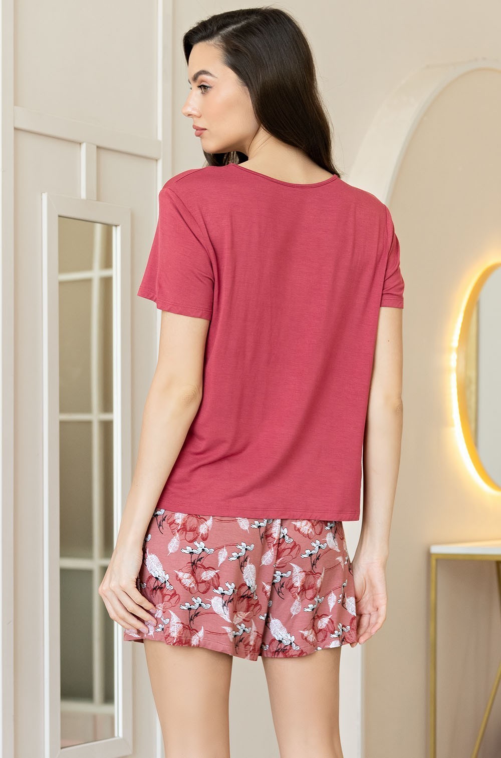 Комплект Mia-Amore состоит из топа cо спущенными плечами и шорт, выполнен из трикотажа. Топ из однотонного трикотажа спереди украшен небольшим монопринтом в виде цветка. Шорты с поясом на резинке выполнены из принтованного трикотажа.