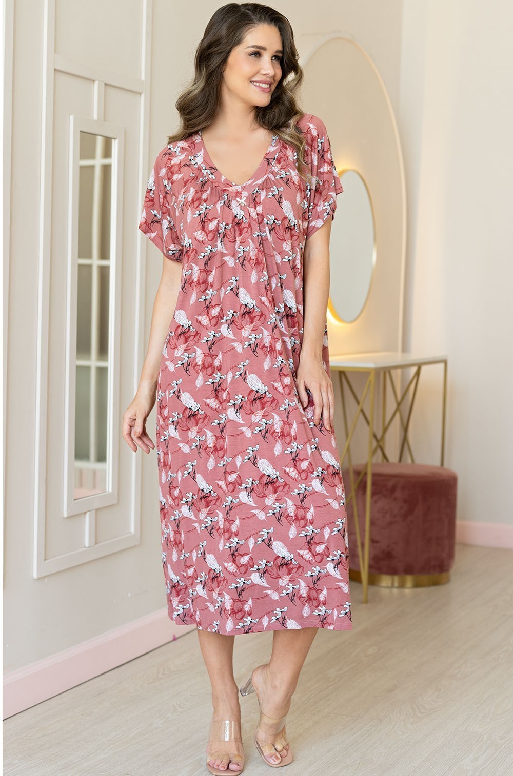 Удобная длинная сорочка Mia-Amore свободного силуэта с короткими рукавами выполнена из принтованного трикотажа. По центру сорочки спереди заложены декоративные складки, по центру горловину украшает декоративный бантик с подвеской.
