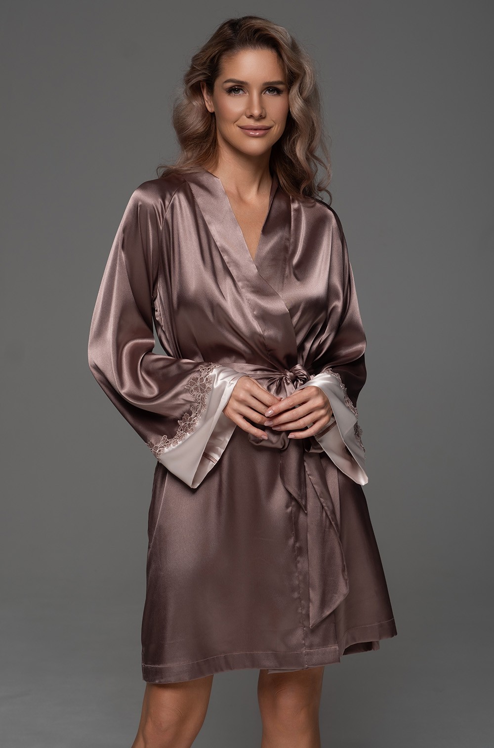 Короткий запашной халат Mia-Amore с длинными рукавами выполнен из однотонного смесового шёлка. Рукава декорированы по низу широким манжетом из перламутрового шёлка и ажурным кружевом. Халат комплектуется широким поясом, в боковых швах карманами.