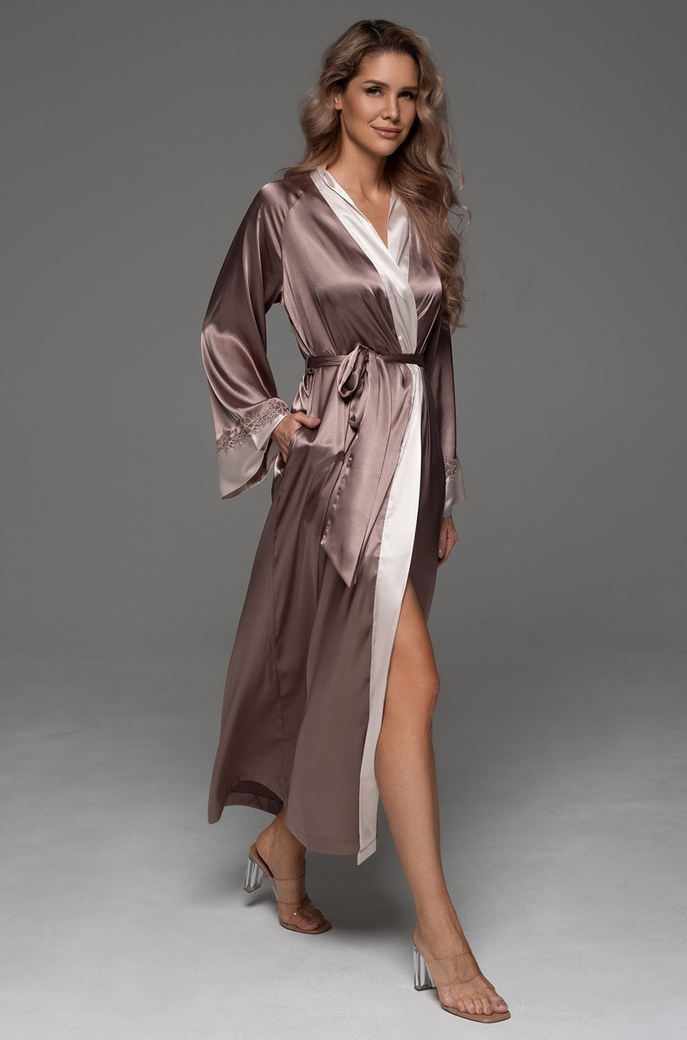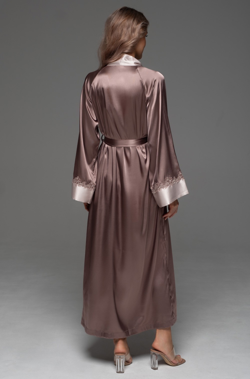 Длинный запашной халат Mia-Amore с длинными рукавами выполнен из однотонного смесового шёлка. Рукава декорированы по низу широким манжетом из перламутрового шёлка и ажурным кружевом. Планка халата также контрастного перламутрового цвета. Халат комплектуется широким поясом, в боковых швах карманами.
