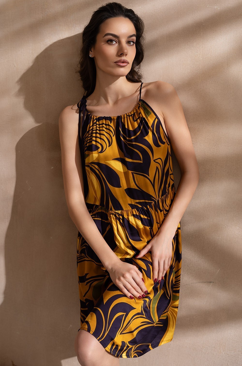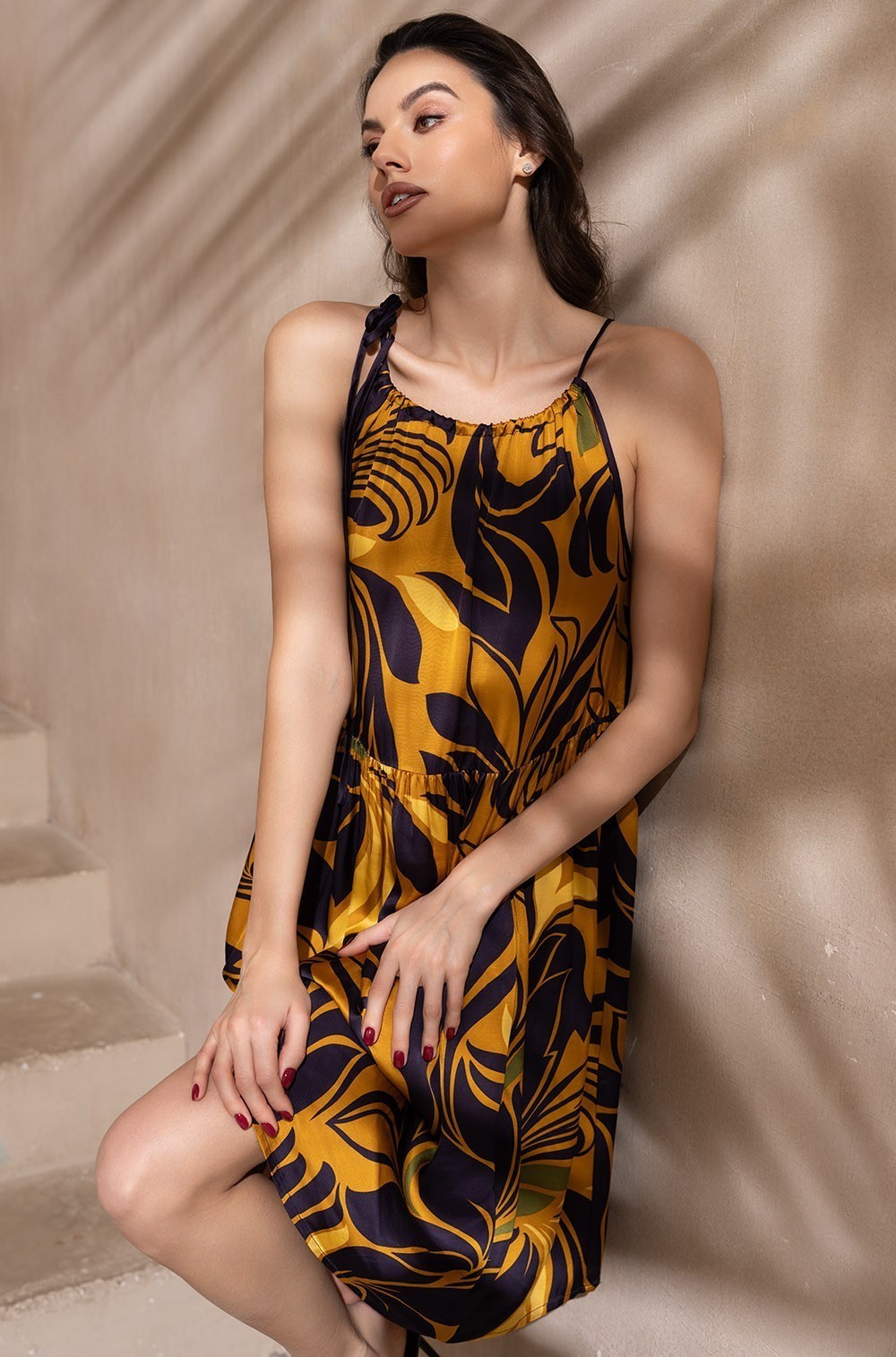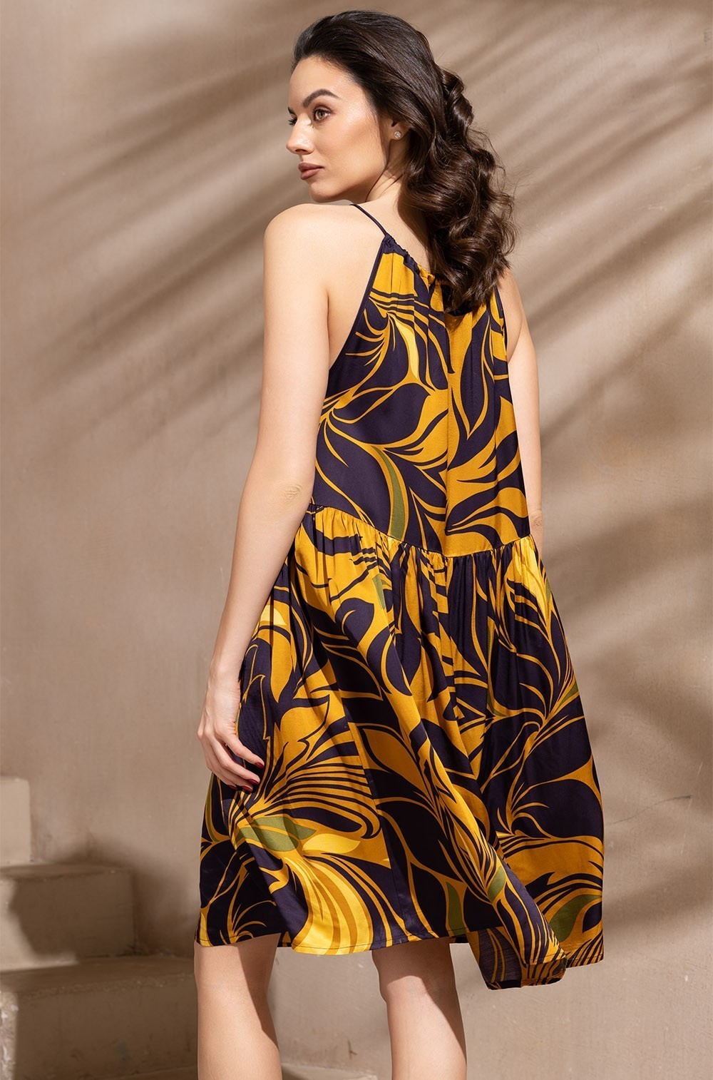 Короткий сарафан Mia-Amore свободного силуэта с оборкой по низу, на тонких бретелях. Изделие выполнено из принтованного смесового шелка.