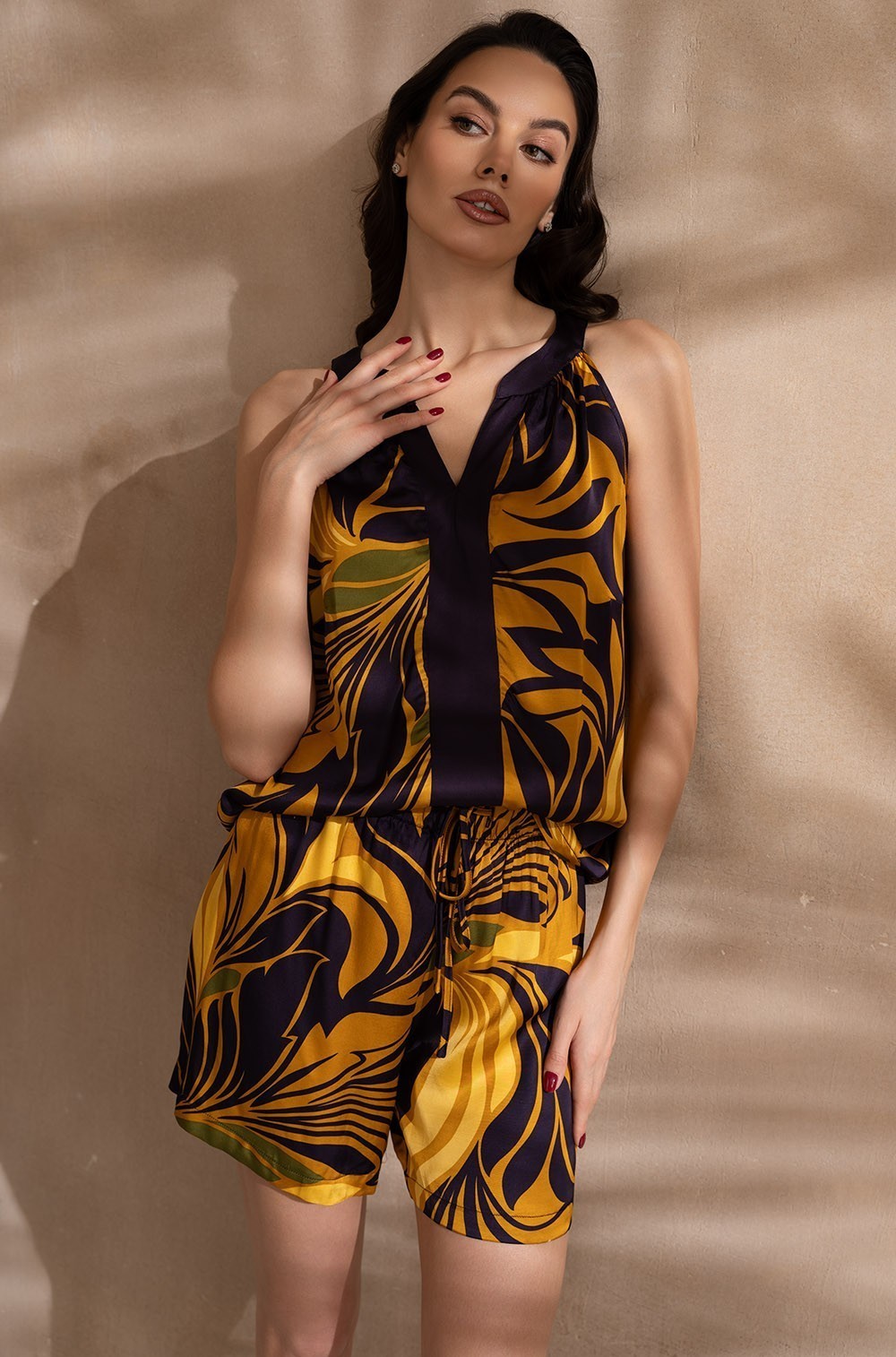 Комплект Mia-Amore состоит из топа свободного силуэта на бретелях и широких шорт. Изделие выполнено из принтованного смесового шелка с однотонной отделкой по центру топа.