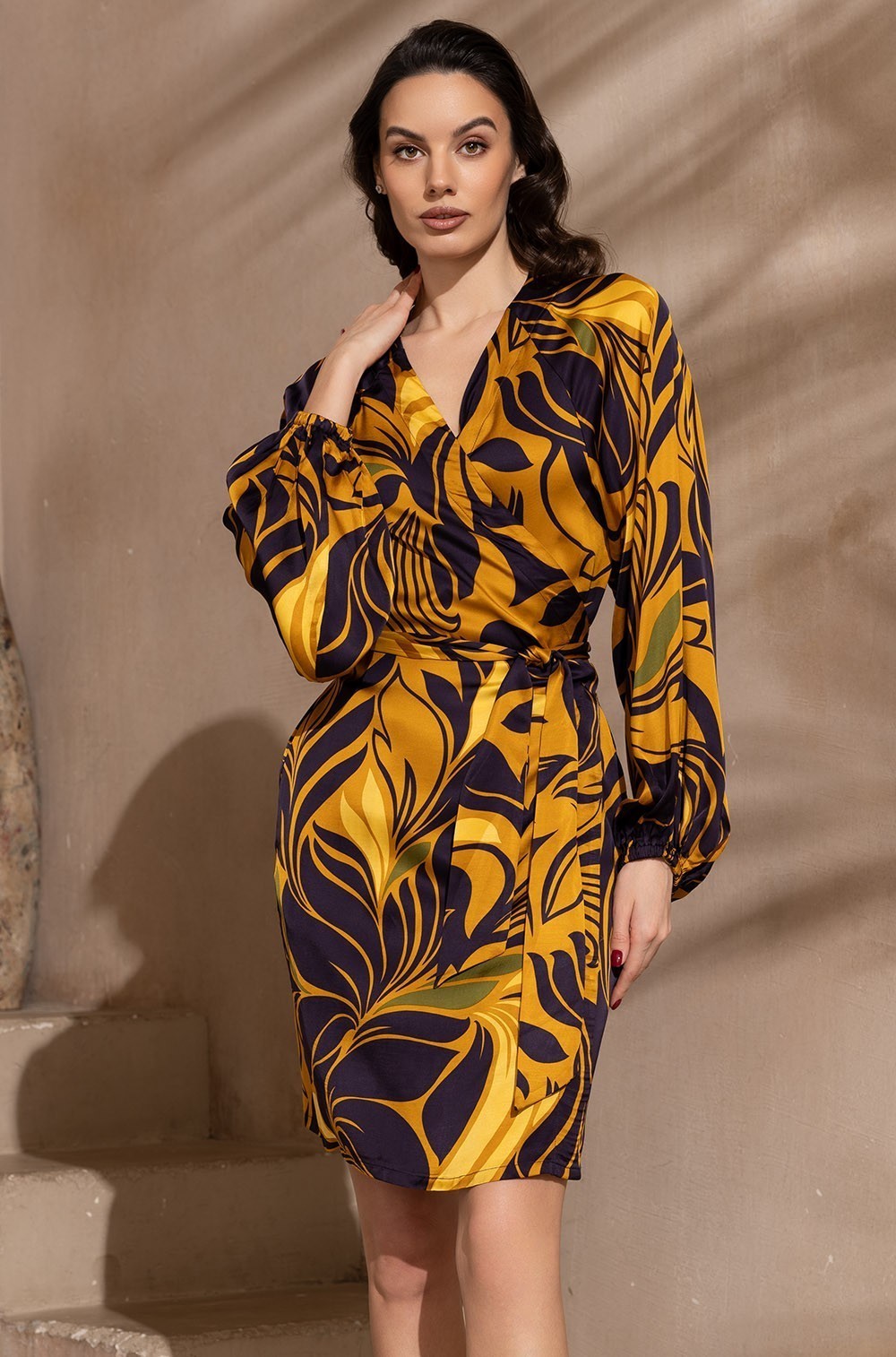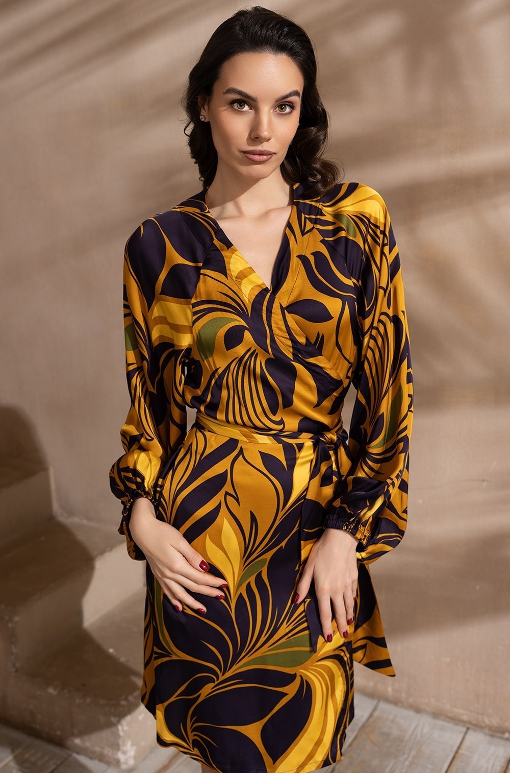 Короткое запашное платье Mia-Amore с длинным объемным рукавом. По бокам расположены карманы. Изделие выполнено из принтованного смесового шелка.