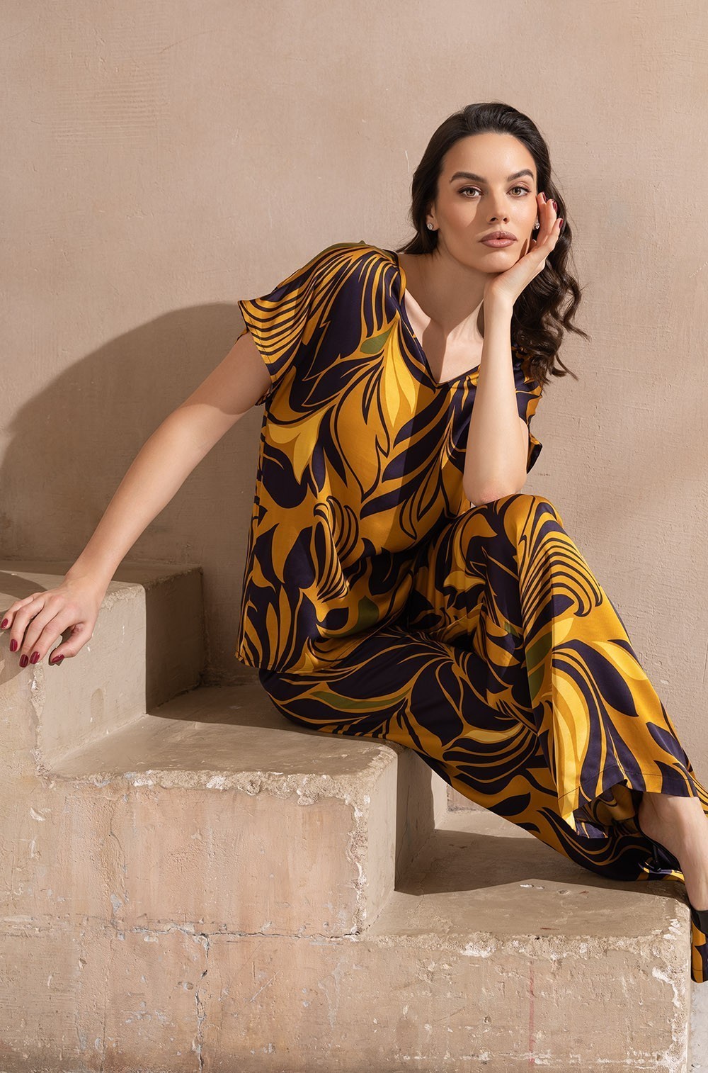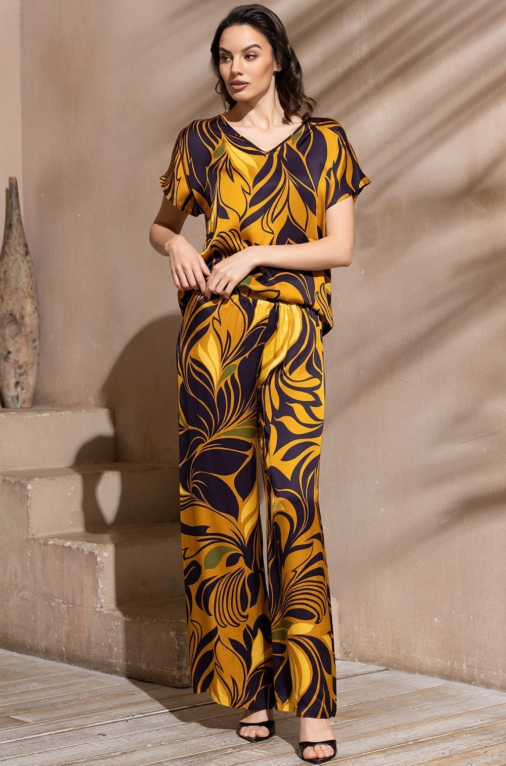 Комплект Mia-Amore состоит из топа свободного силуэта с коротким рукавом и широких брюк-палаццо. Изделия комплекта выполнены из принтованного смесового шелка.