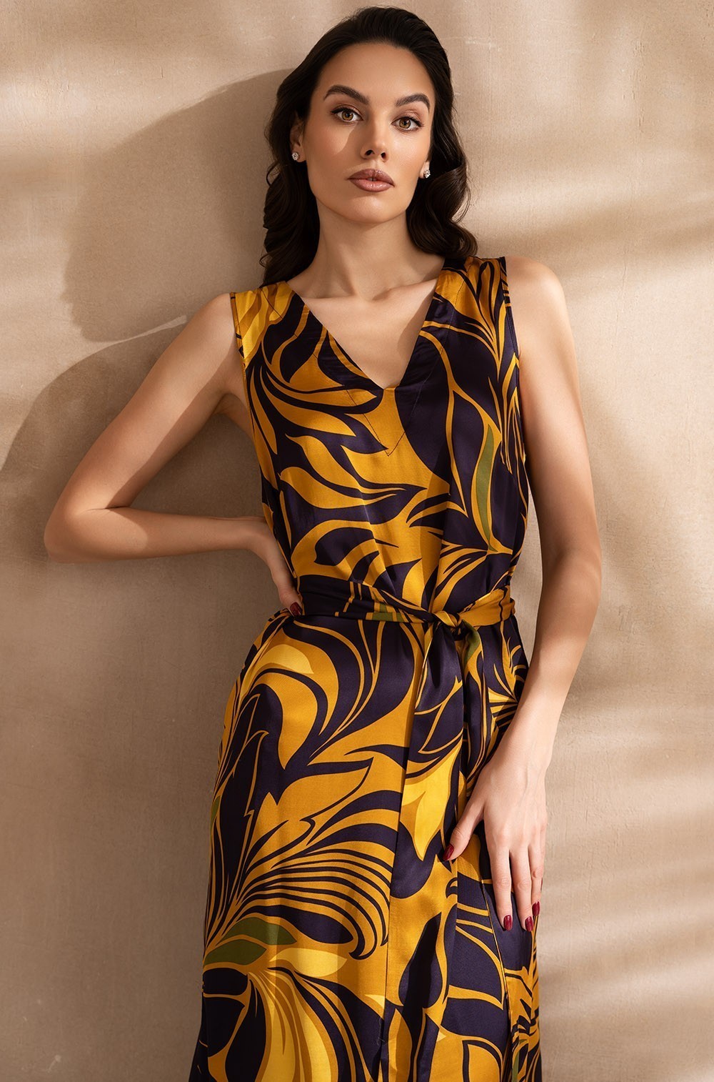 Длинный сарафан Mia-Amore свободного силуэта на широких бретелях и разрезами по бокам, длину которых можно регулировать за счет пуговиц. Изделие выполнено из принтованного смесового шелка. Линию талии можно подчеркнуть за счет пояса, который идет в комплекте.