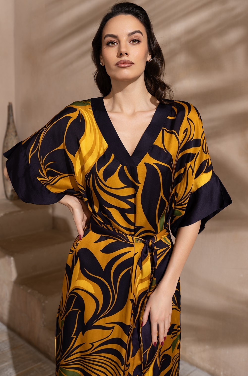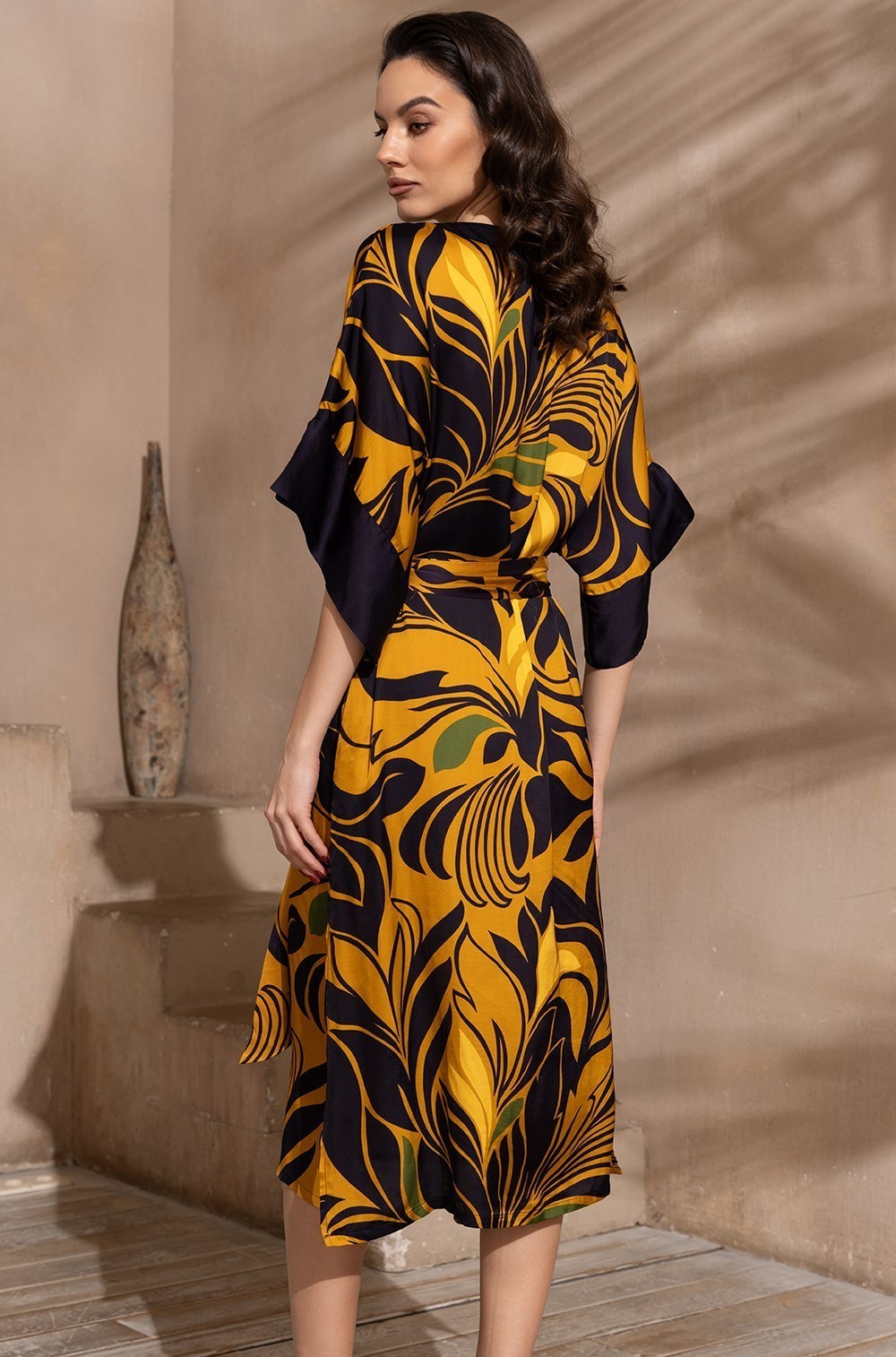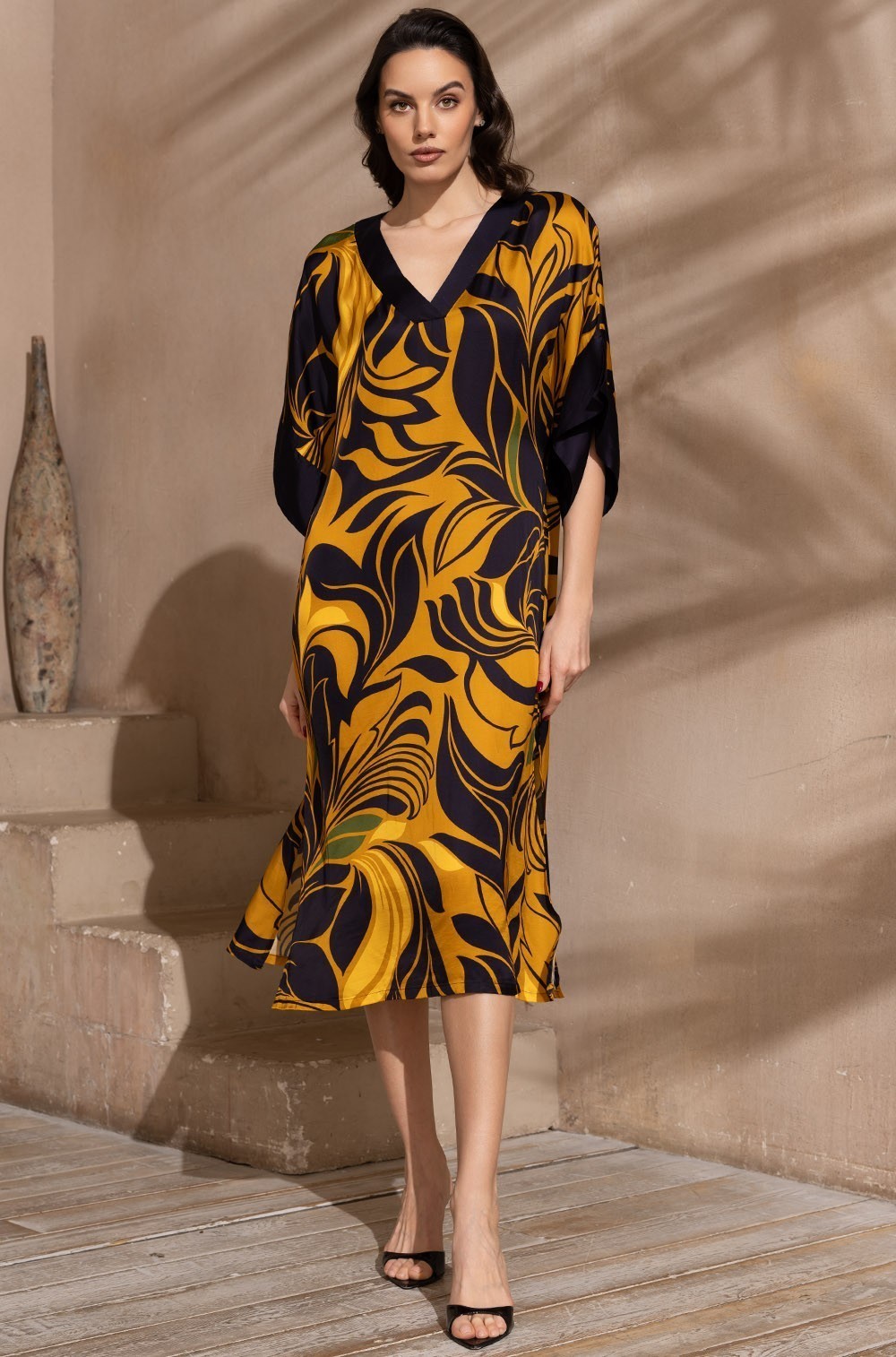 Длинная туника Mia-Amore с широким рукавом длиной до локтя. Изделие выполнено из принтованного смесового шелка с однотонной отделкой по вырезу и низу рукавов. В боковых швах обработаны карманы. По бокам расположены разрезы для свободы движения. Линию талии можно подчеркнуть за счет пояса, который идет в комплекте.