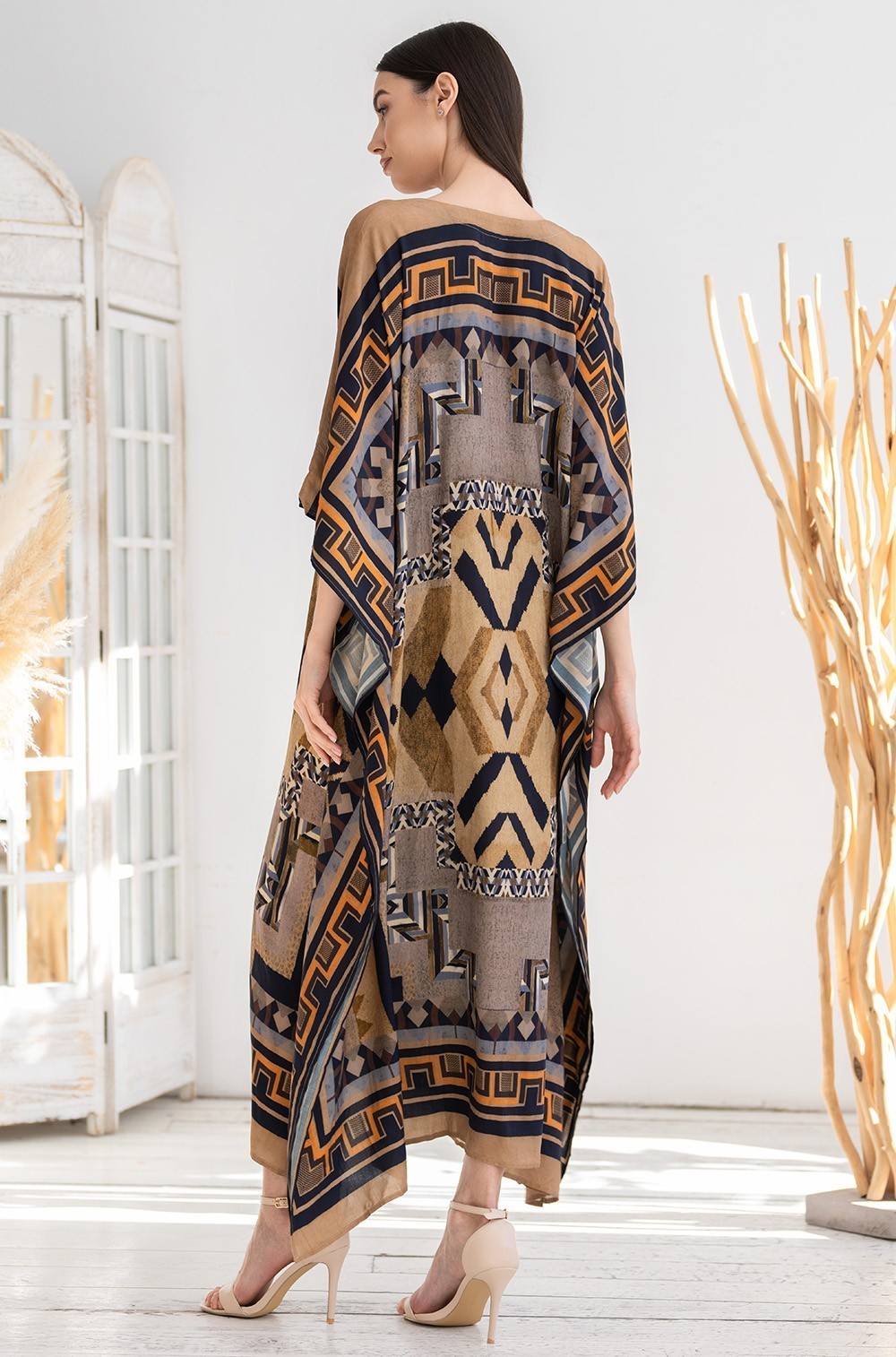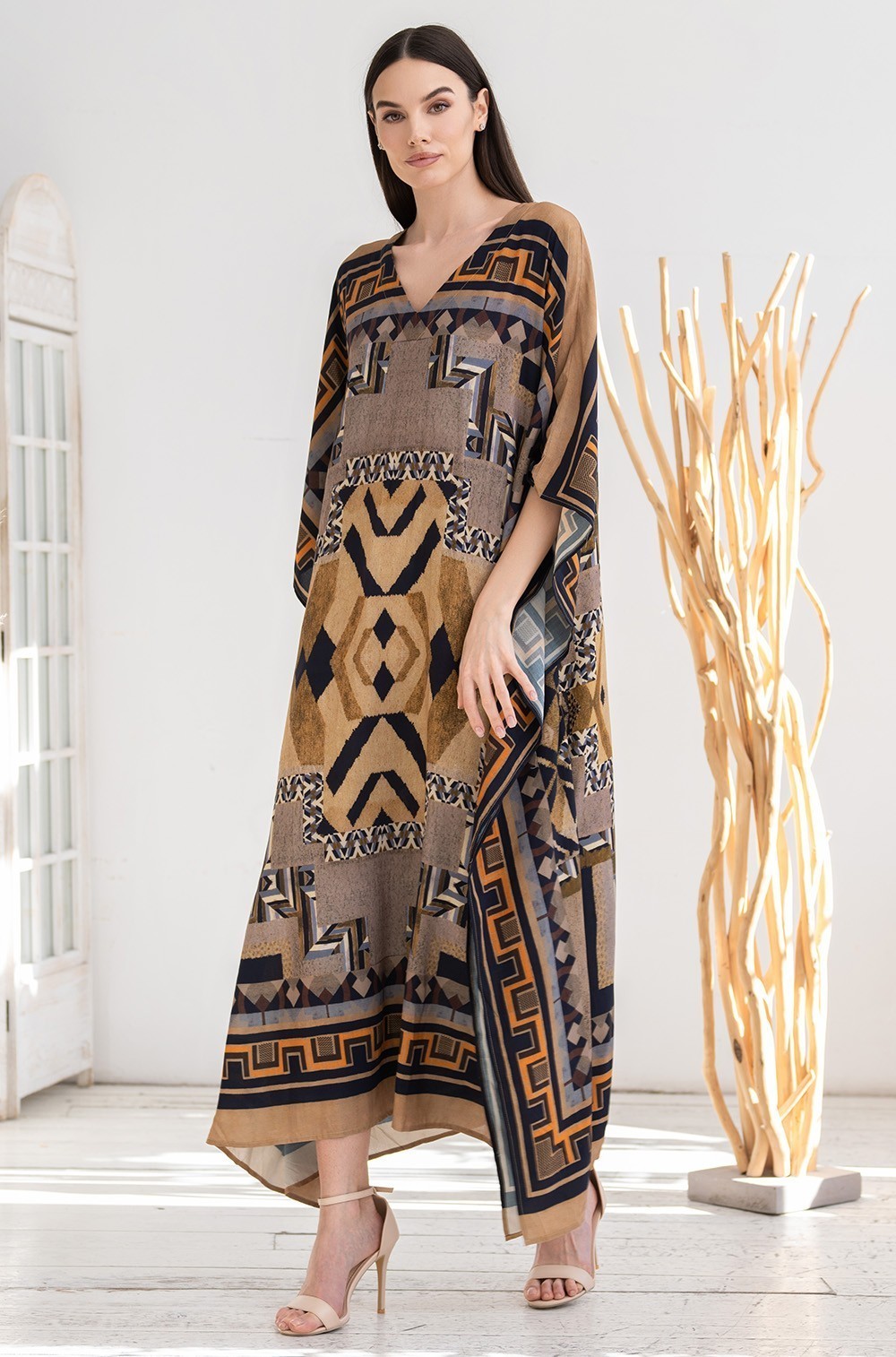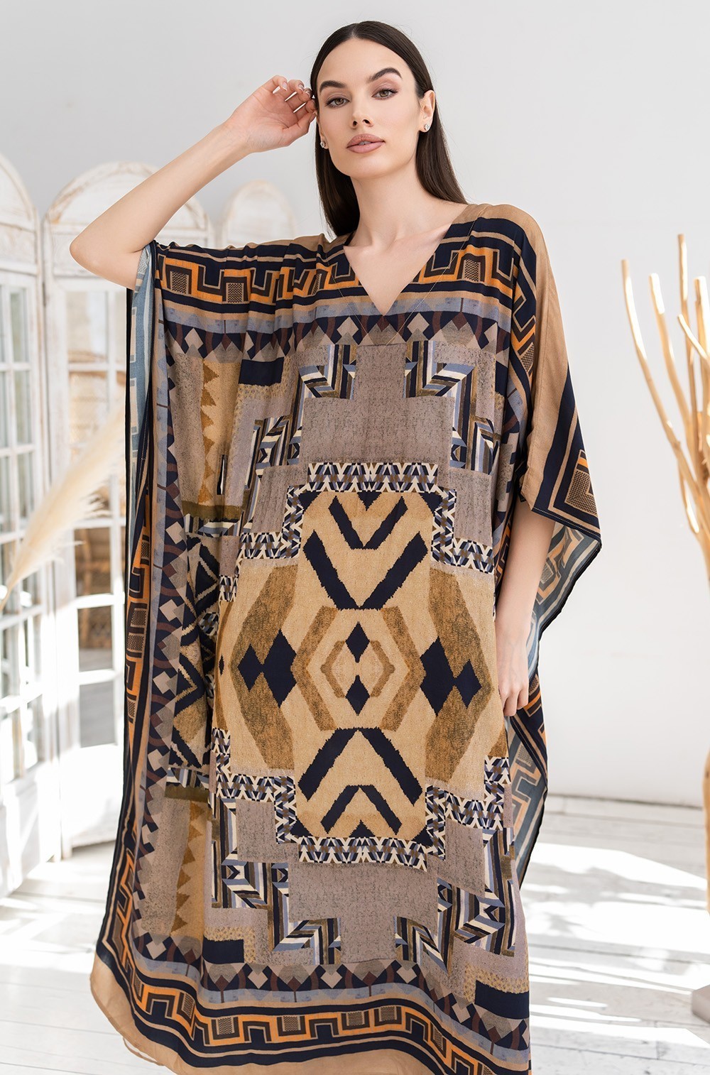 Длинная туника Mia-Amore свободного силуэта и с удлиненной линией плеча и V-образным вырезом горловины. Изделие выполнено из тканой вискозы с купонным принтом. Линию талии можно подчеркнуть за счет пояса, который идет в комплекте.