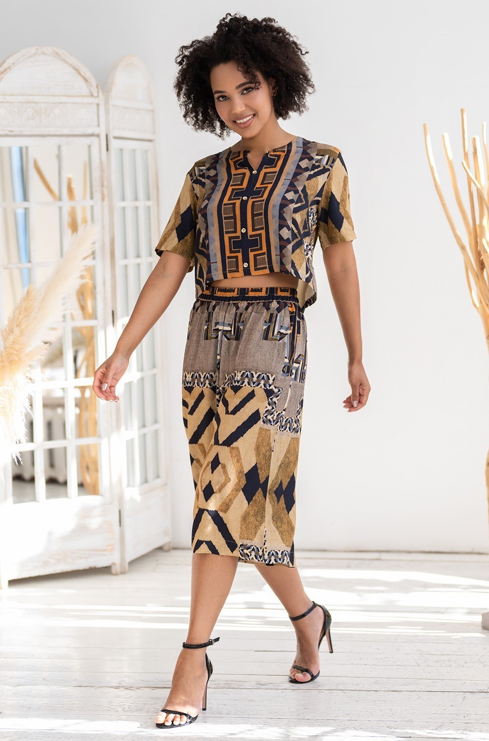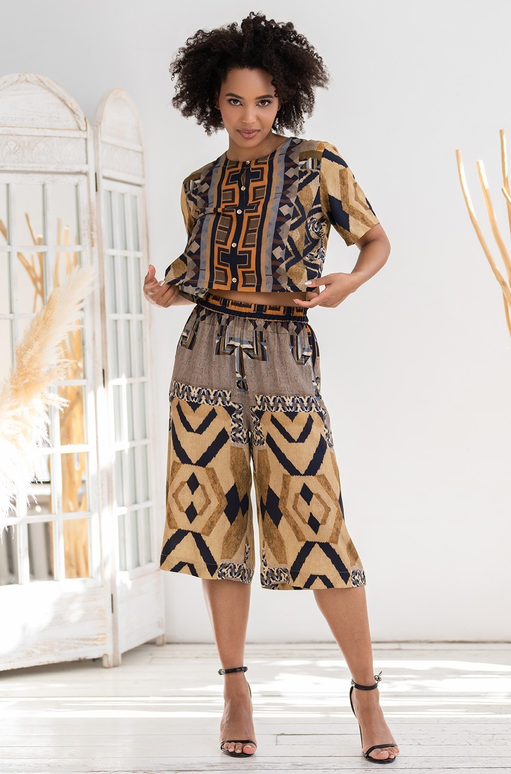 Комплект Mia-Amore состоит из короткой рубашки с воротником-стойкой и удлиненных шорт, выполнен из тканой вискозы с купонным принтом. Шорты с широким эластичным поясом. По бокам шорт расположены карманы.