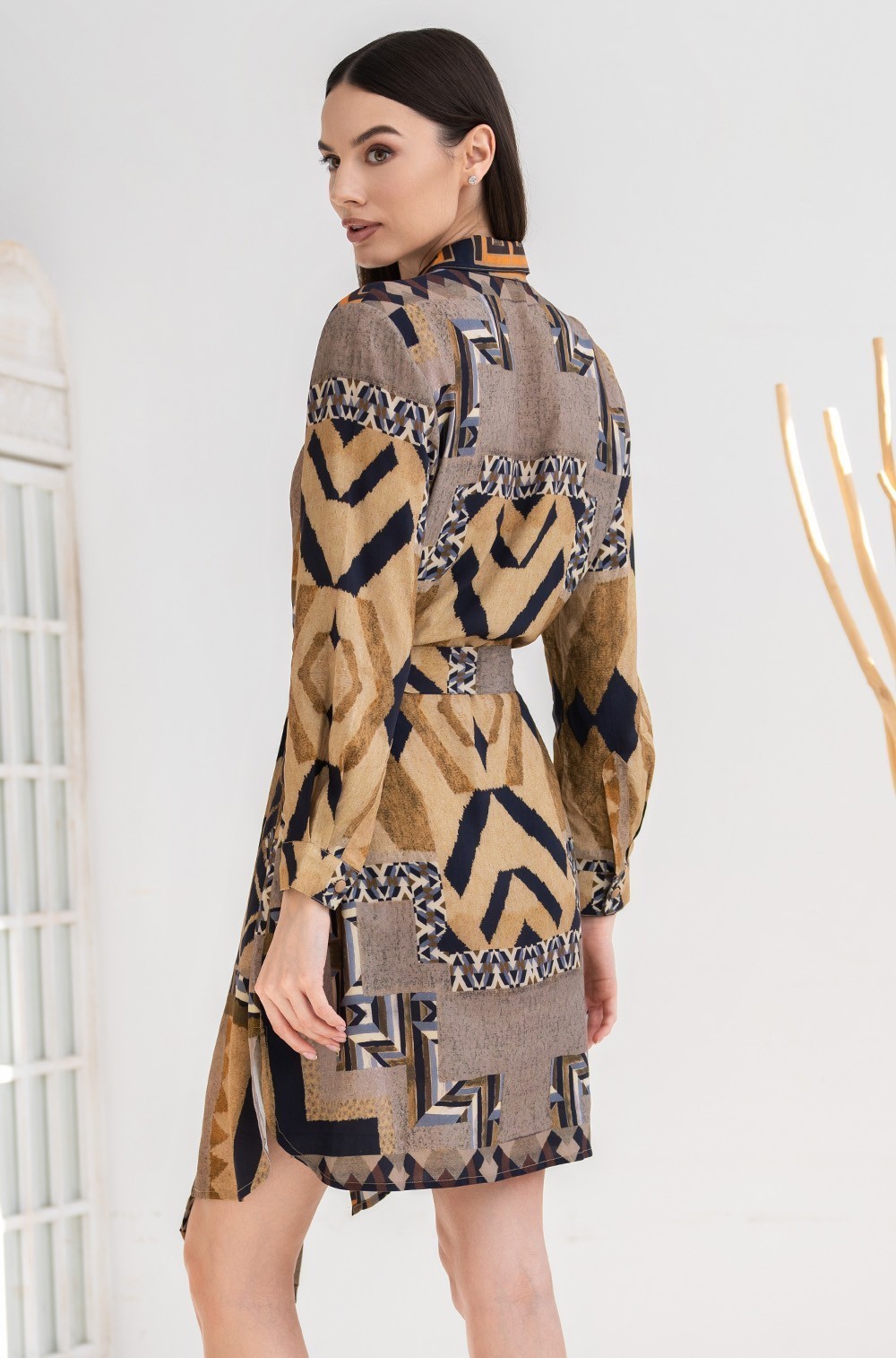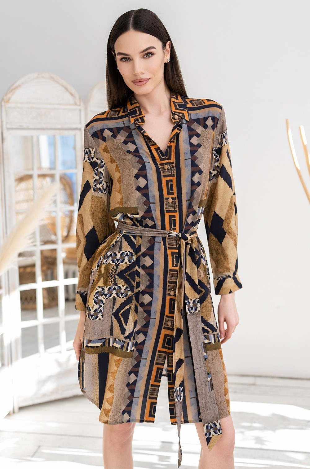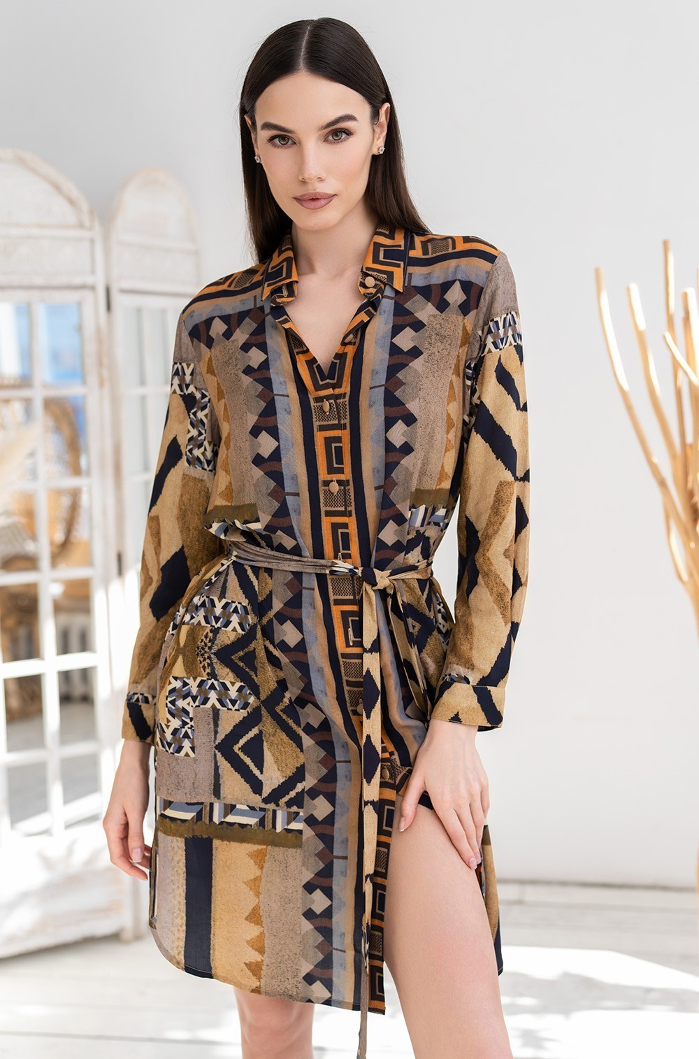 Рубашка средней длины Mia-Amore выполнена из тканой вискозы с купонным принтом. Рубашка на пуговицах с рукавом ¾, рубашечным воротником и разрезами по бокам, по талии регулируется съемным поясом. Низ рукавов рубашки оформлен узкой манжетой. В боковых швах есть карманы.