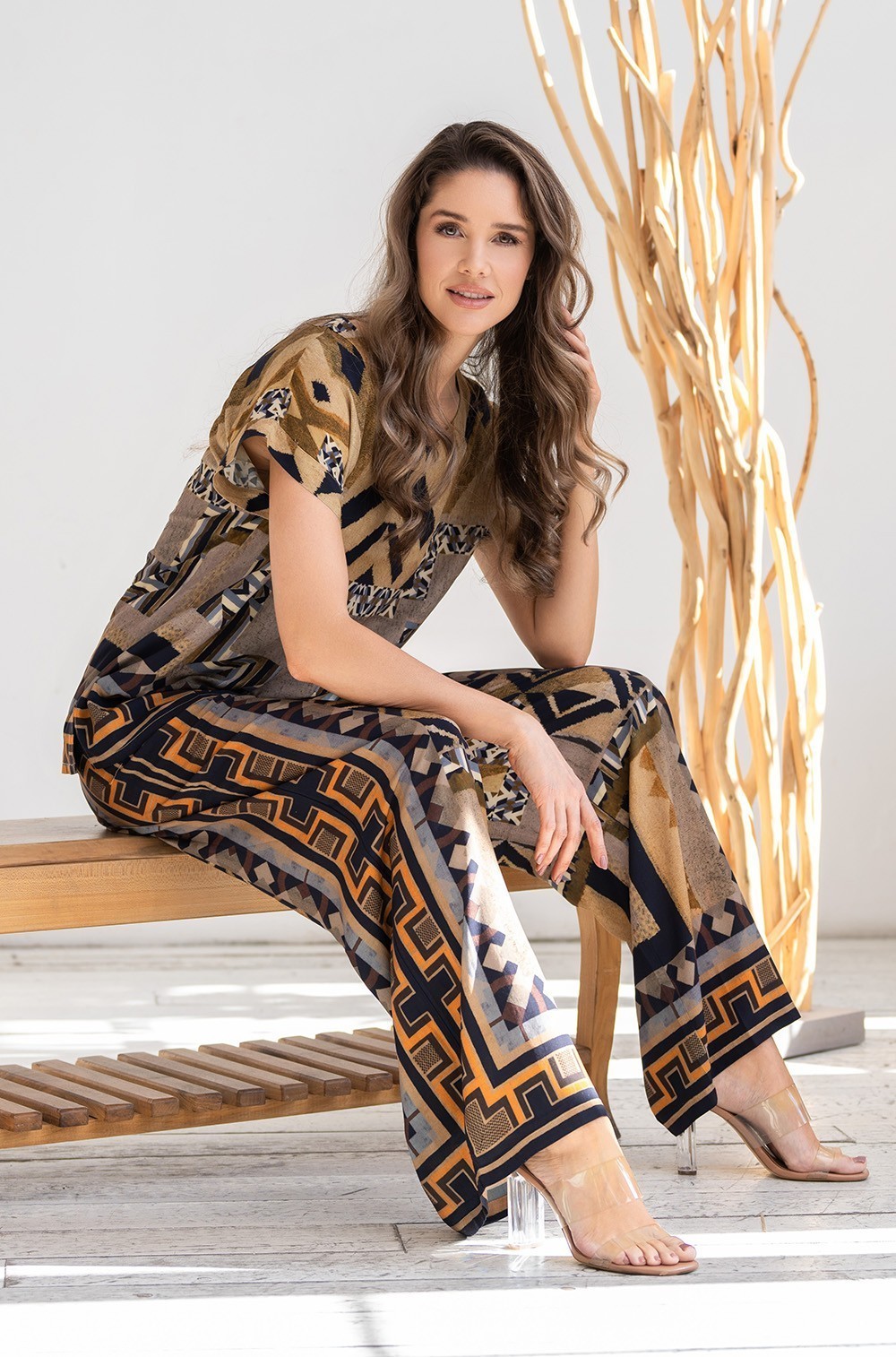 Комплект Mia-Amore состоит из топа с коротким рукавом и свободных брюк. Изделия комплекта выполнены из тканой вискозы с купонным принтом. Топ с округлым вырезом горловины. Брюки свободного силуэта с поясом на резинке и боковыми карманами.