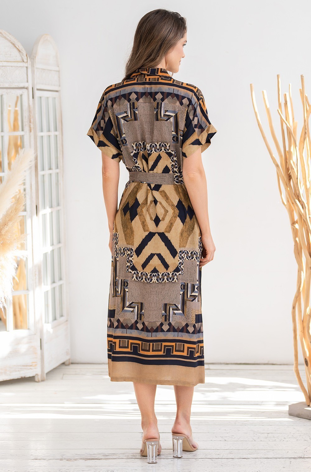 Длинная рубашка Mia-Amore выполнена из тканой вискозы с купонным принтом. Рубашка на пуговицах с короткими цельнокроенными рукавами, рубашечным воротником и разрезами по бокам, по талии регулируется съемным поясом. Низ рукавов рубашки оформлен узкой манжетой. В боковых швах есть карманы.