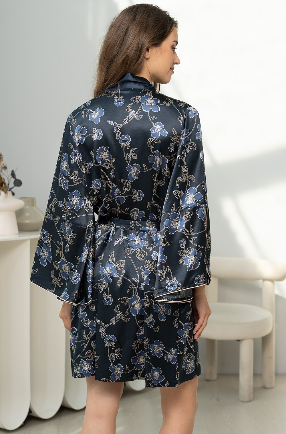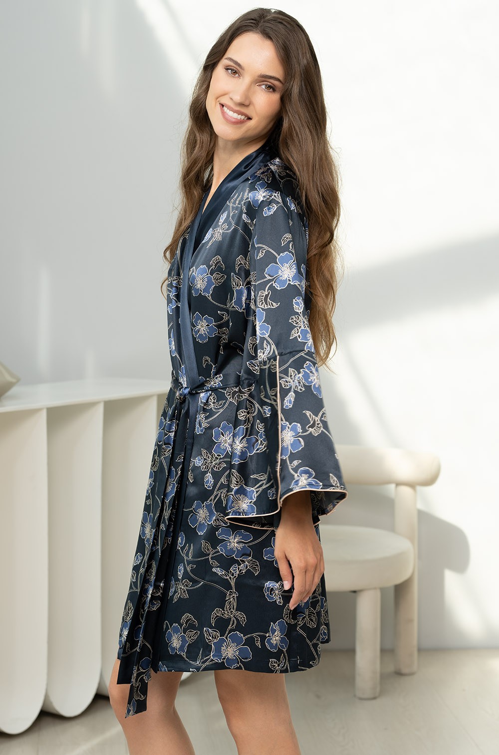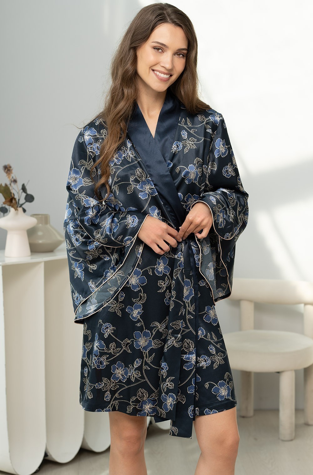 Короткий халат Mia-Amore выполнен из принтованного смесового шёлка. Планка выполнена с широкой однотонной отделкой. Халат декорирован однотонным кантом.