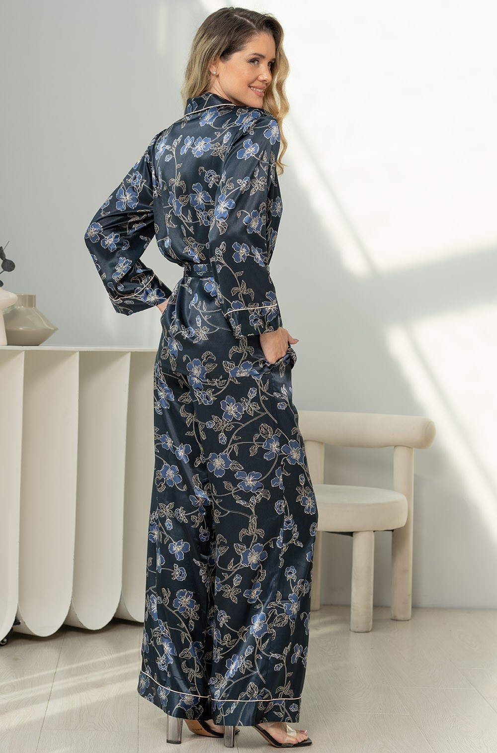 Комплект Mia-Amore состоит из жакета с центральной застежкой на пуговицах и брюк выполненного из принтованного смесового шёлка. Комплект декорирован однотонным кантом по борту, воротнику, на манжетах рукавов и брюк.