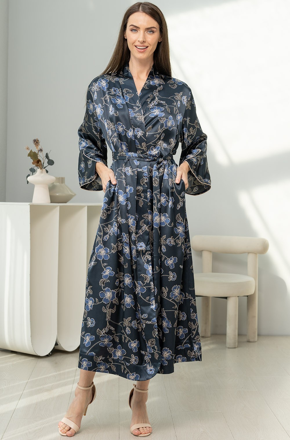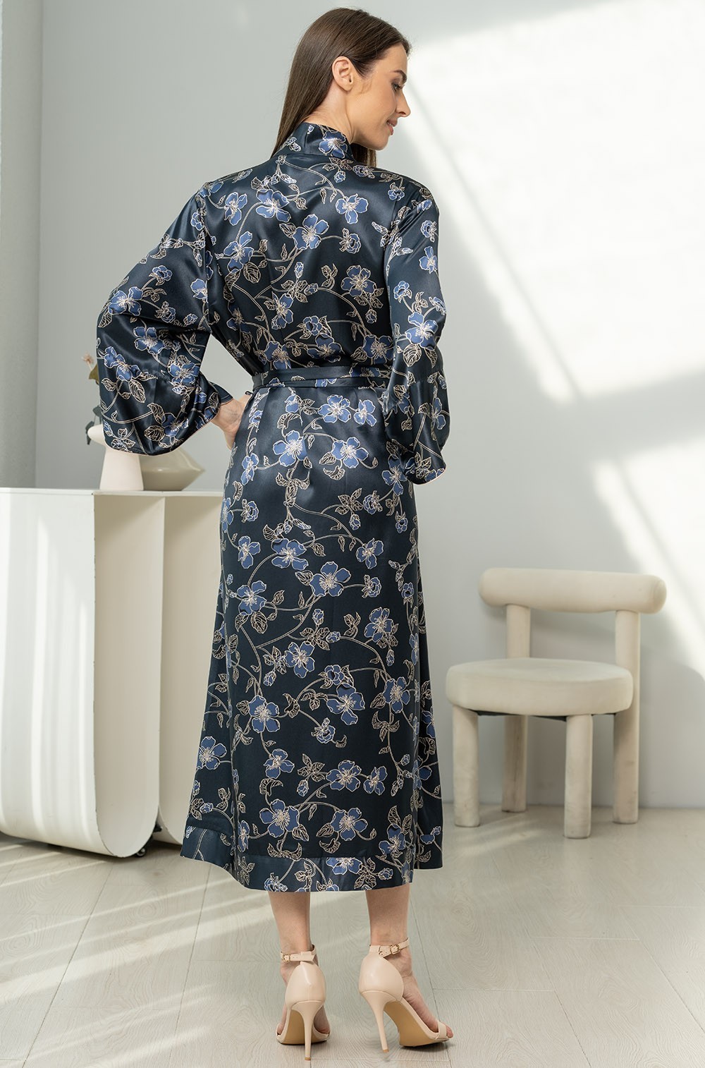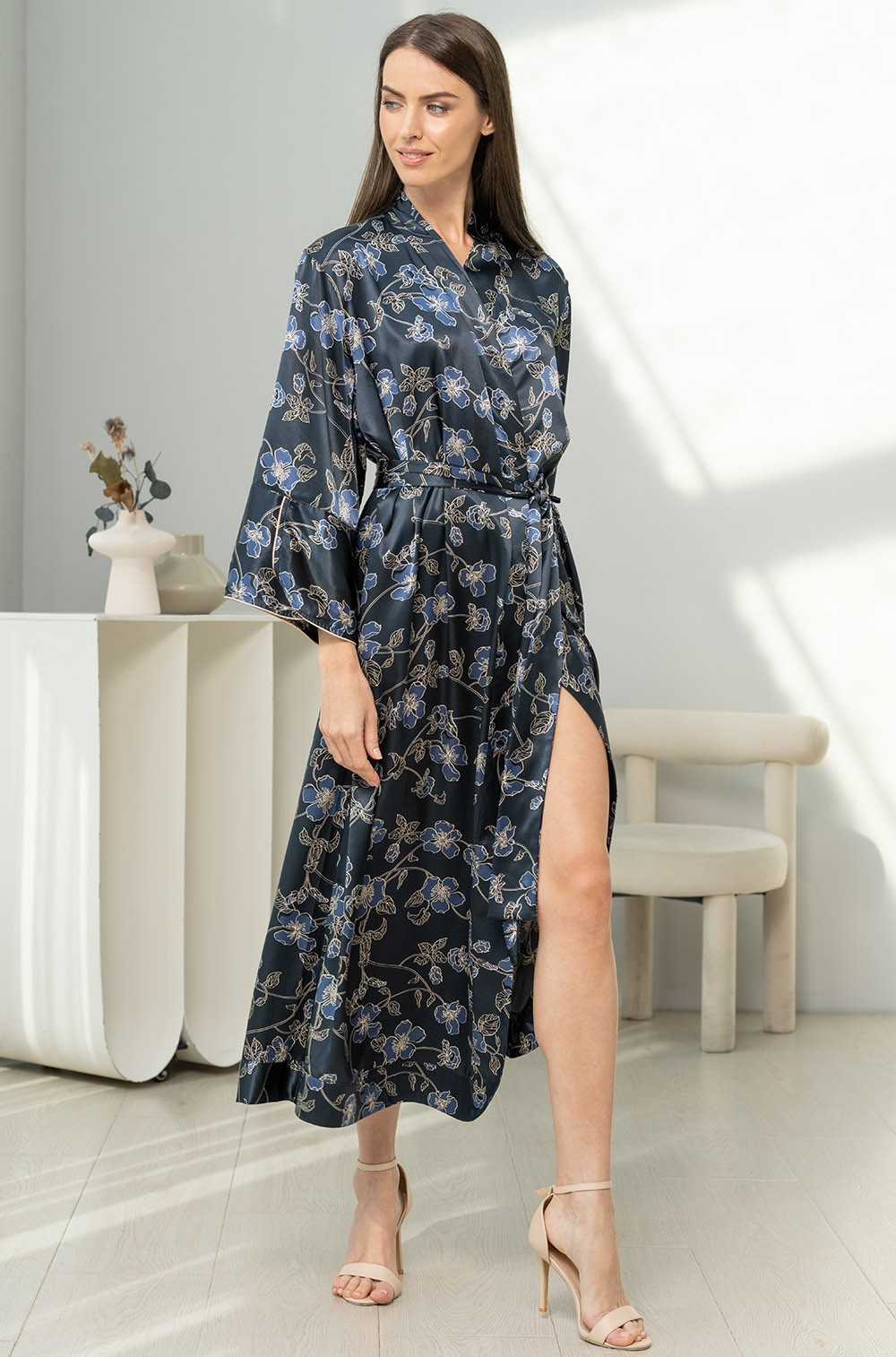 Длинный халат Mia-Amore выполнен из принтованного смесового шёлка. Планка, низ рукавов и низ халата, выполнены с широкой однотонной отделкой.