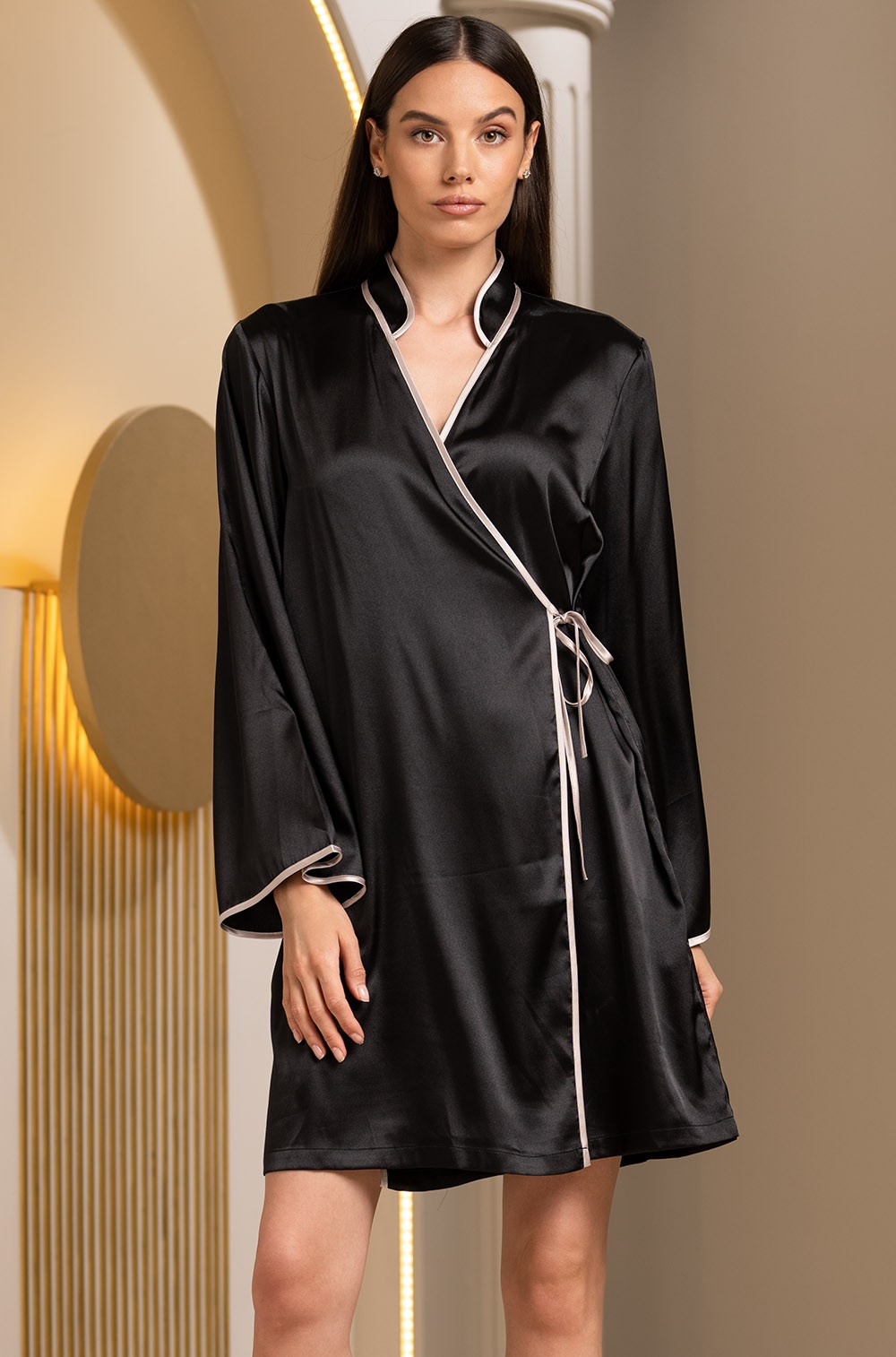 Кимоно Mia-Amore c длинным рукавом, воротником стойкой и запахом выполнено из однотонного смесового шёлка. Завязывается на тонкий однотонный пояс. Кимоно декорировано однотонной обтачкой по воротнику, борту и низу рукавов.