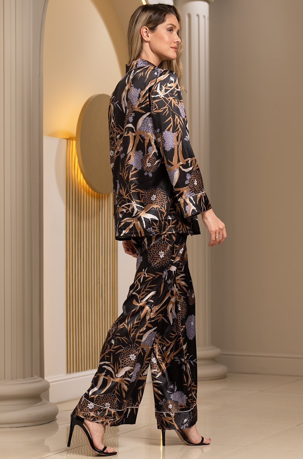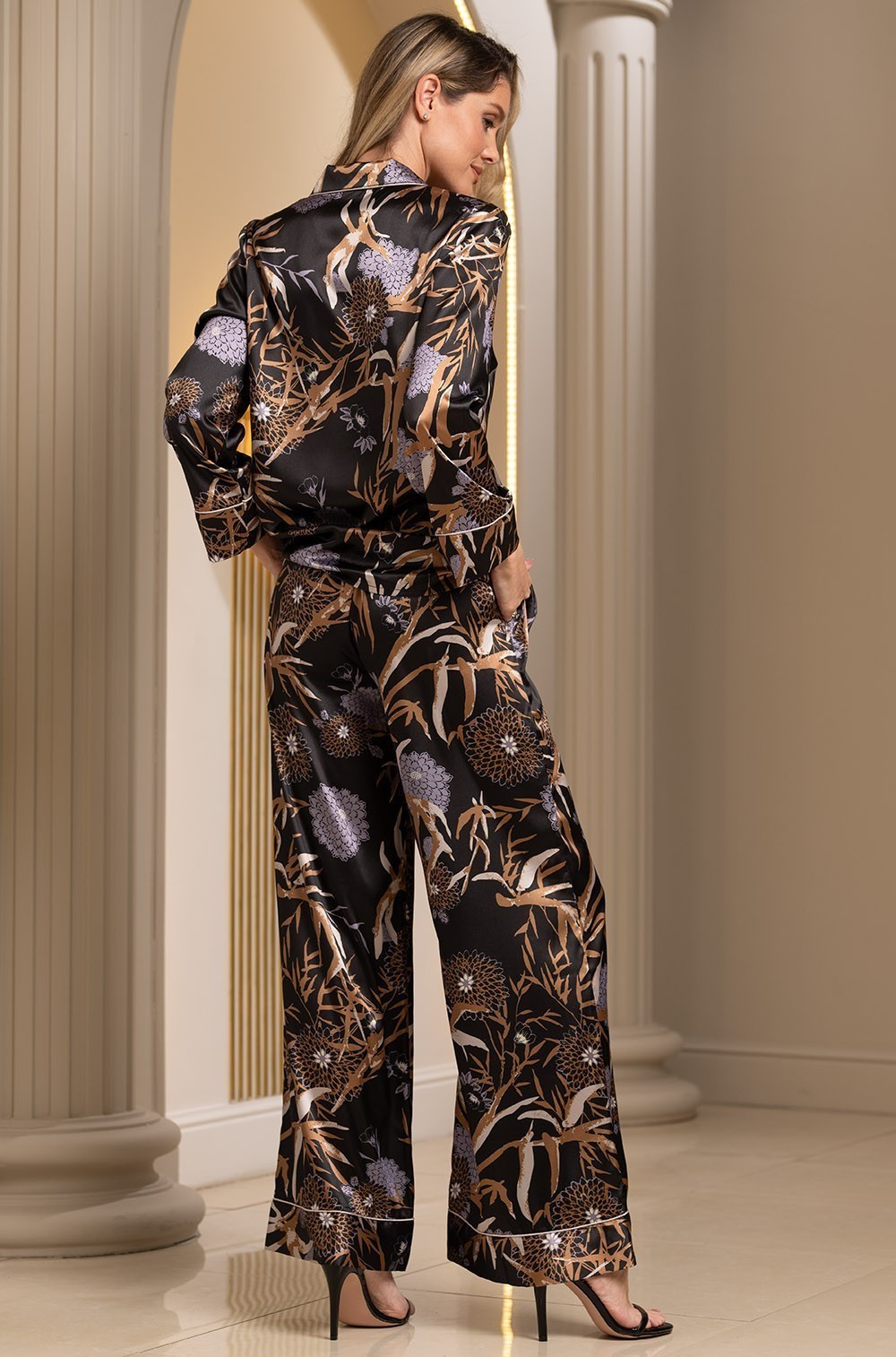 Комплект Mia-Amore состоит из жакета и брюк выполненных из принтованного смесового шёлка. Жакет декорирован по борту, низу рукавов и низу изделия однотонной обтачкой.