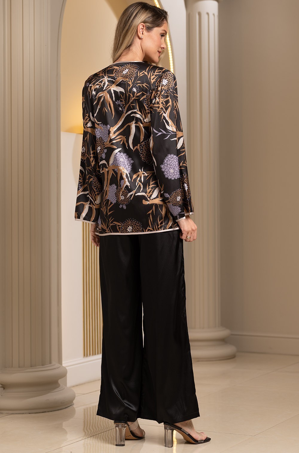 Комплект-тройка Mia-Amore состоит из принтованного жакета, однотонных чёрных брюк и топа выполненных из смесового шёлка. Жакет декорирован по борту, низу рукавов и низу изделия однотонной обтачкой. Завязывается жакет на однотонный пояс.