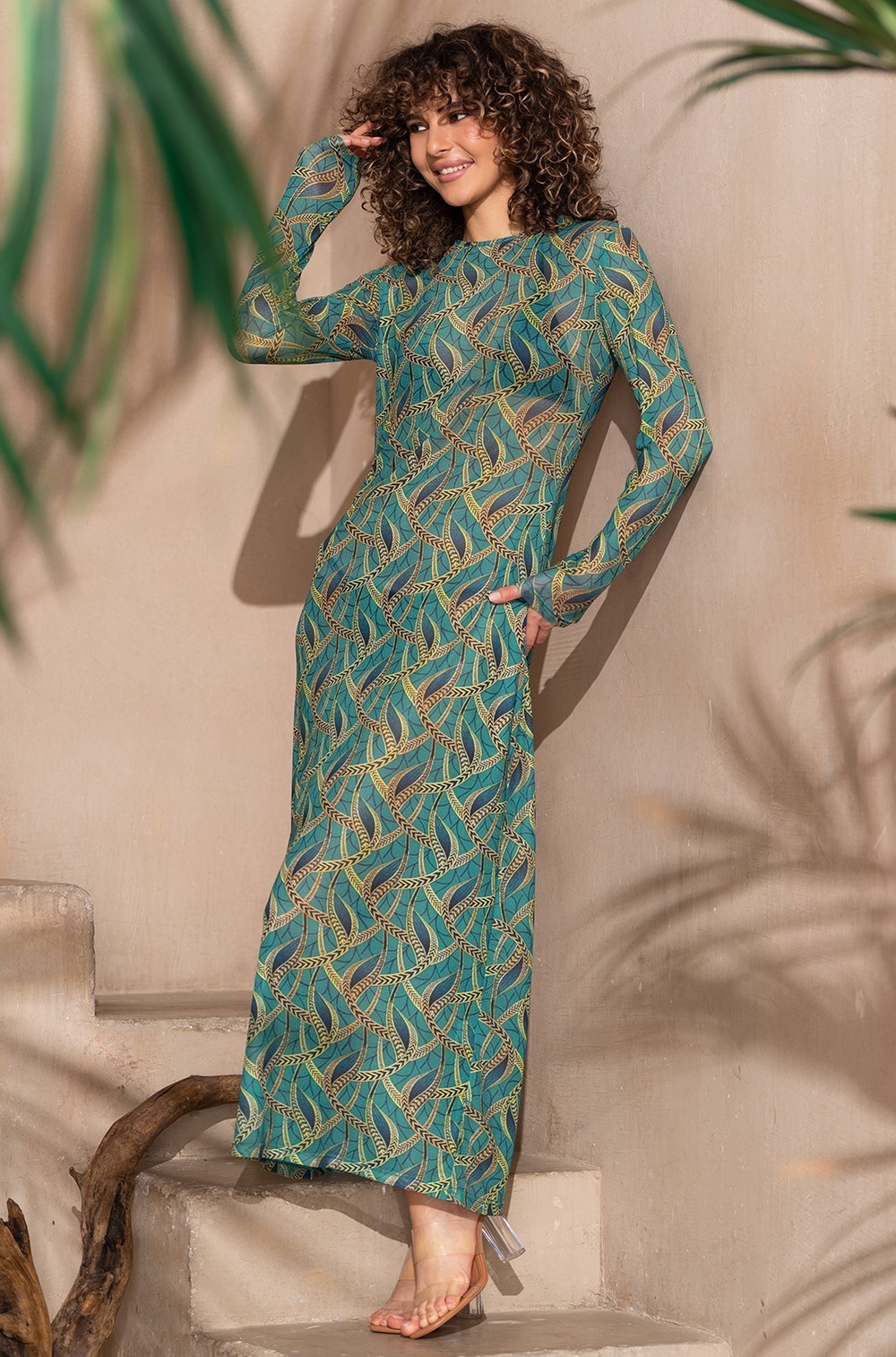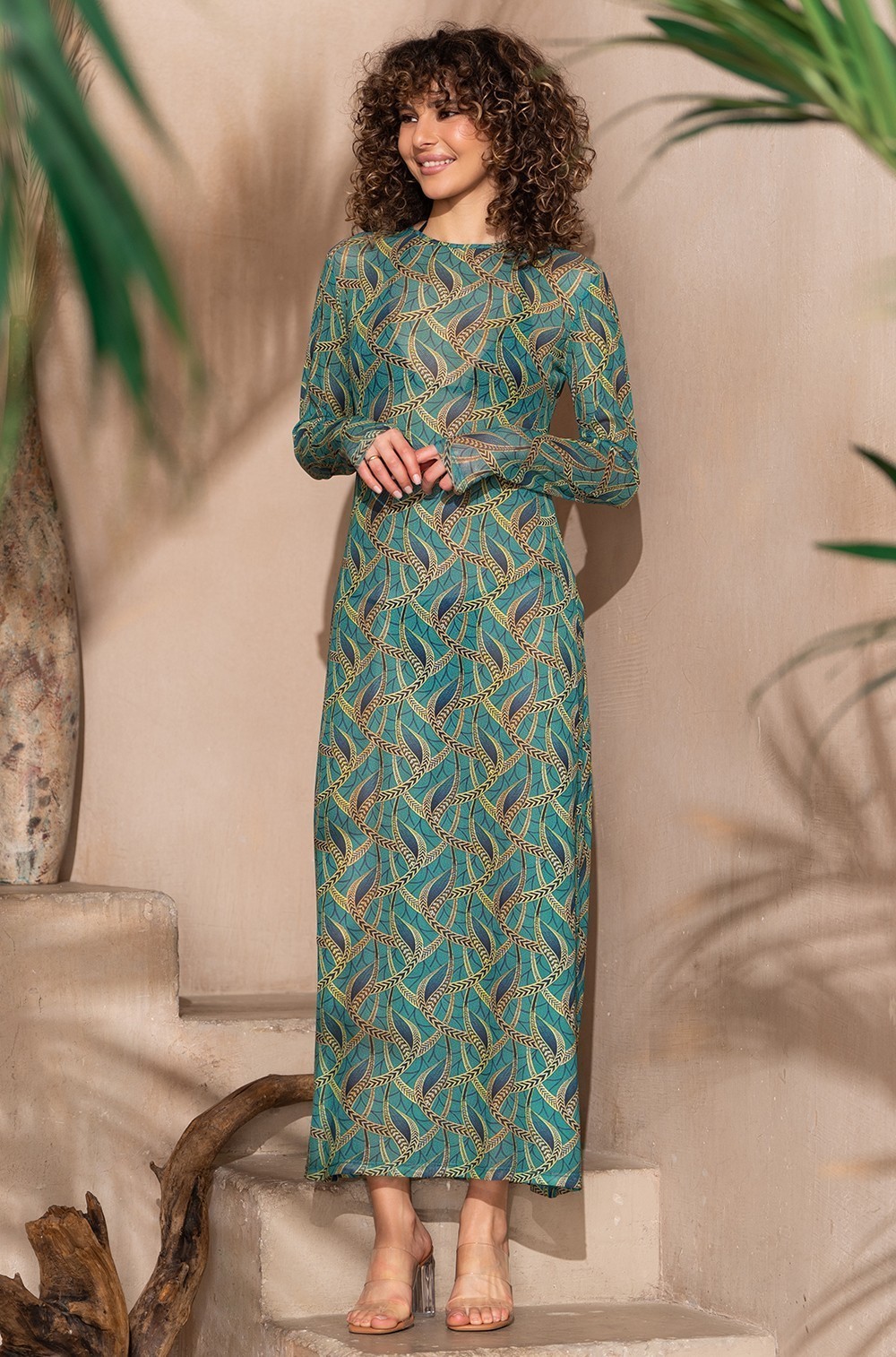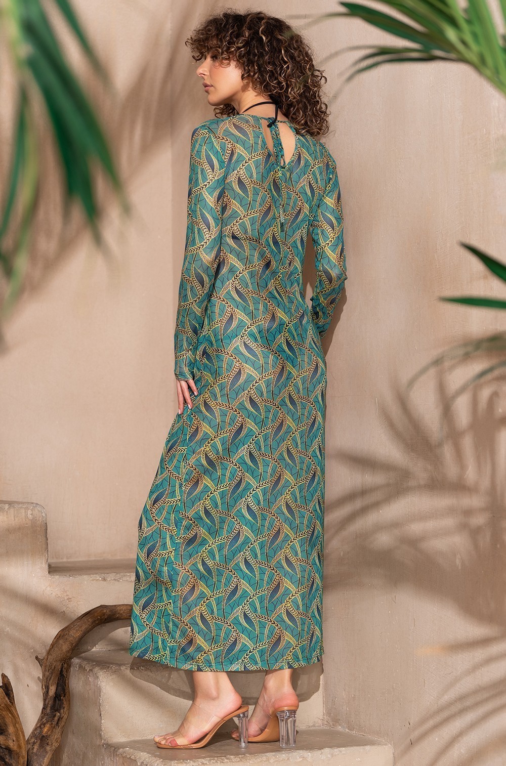 Длинное платье-туника Mia-Amore полуприлегающего силуэта с длинными рукавами выполнена из тонкой мягкой принтованной сетки. Горловина сзади регулируется завязками.