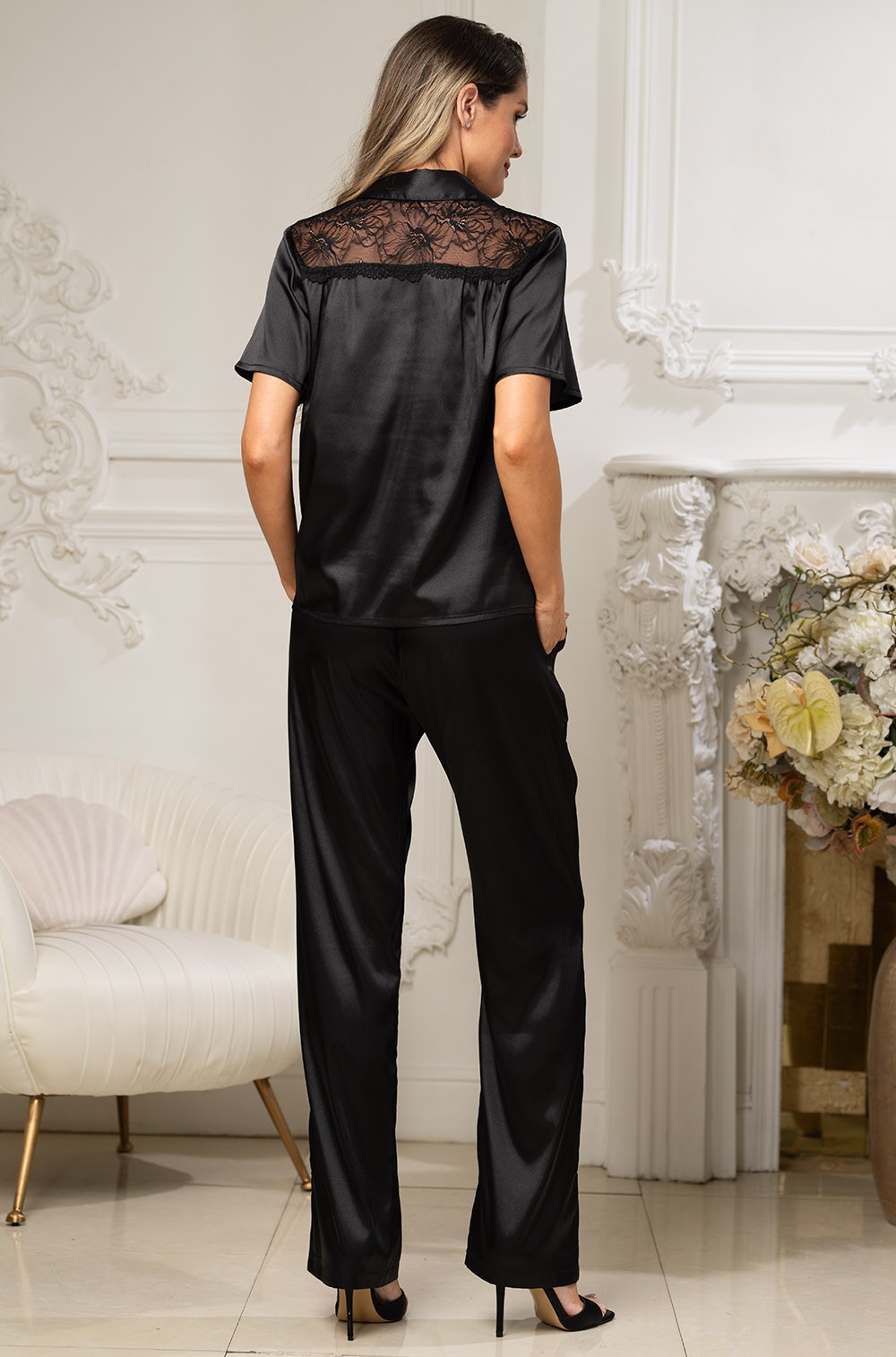 Комплект Mia-Amore из однотонного искусственного шелка, состоит из жакета с короткими рукавами и брюк. Кокетка спинки жакета выполнена из французского кружева. В боковых швах брюк обработаны карманы.