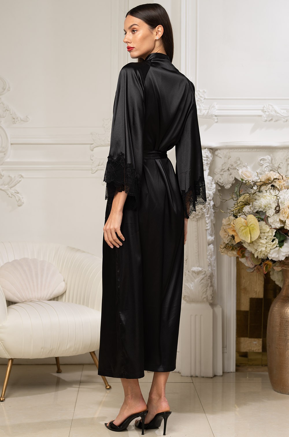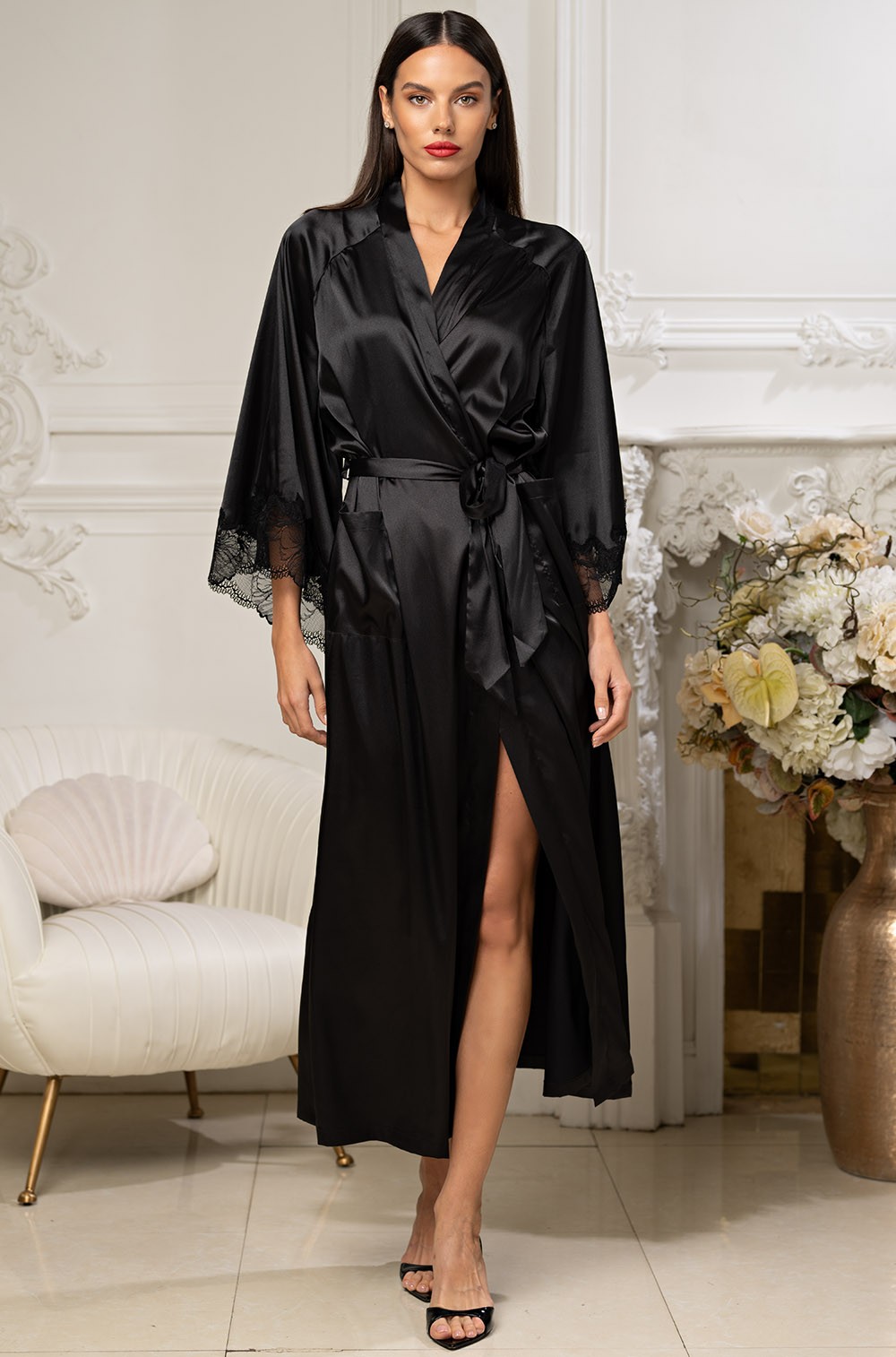 Длинный запашной халат Mia-Amore с рукавами длиной ¾. Халат выполнен из однотонного искусственного шелка. Рукава халата декорированы ажурным французским кружевом, кромка ткани вырезана по форме кружева. В боковых швах расположены карманы. Линия талии подчеркивается за счет пояса.