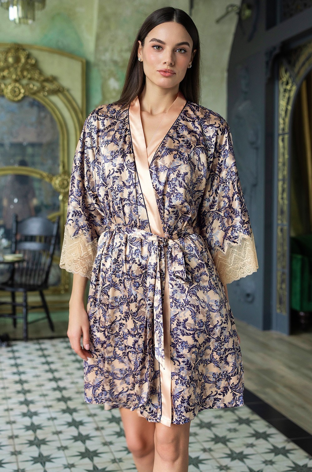 Короткий запашной халат-кимоно Mia-Amore с широким рукавом длиной 3/4. Халат выполнен из искусственного принтованного шелка с однотонной и кружевной отделкой. Линию борта подчеркивает контрастный кант. В боковых швах халата обработаны карманы.