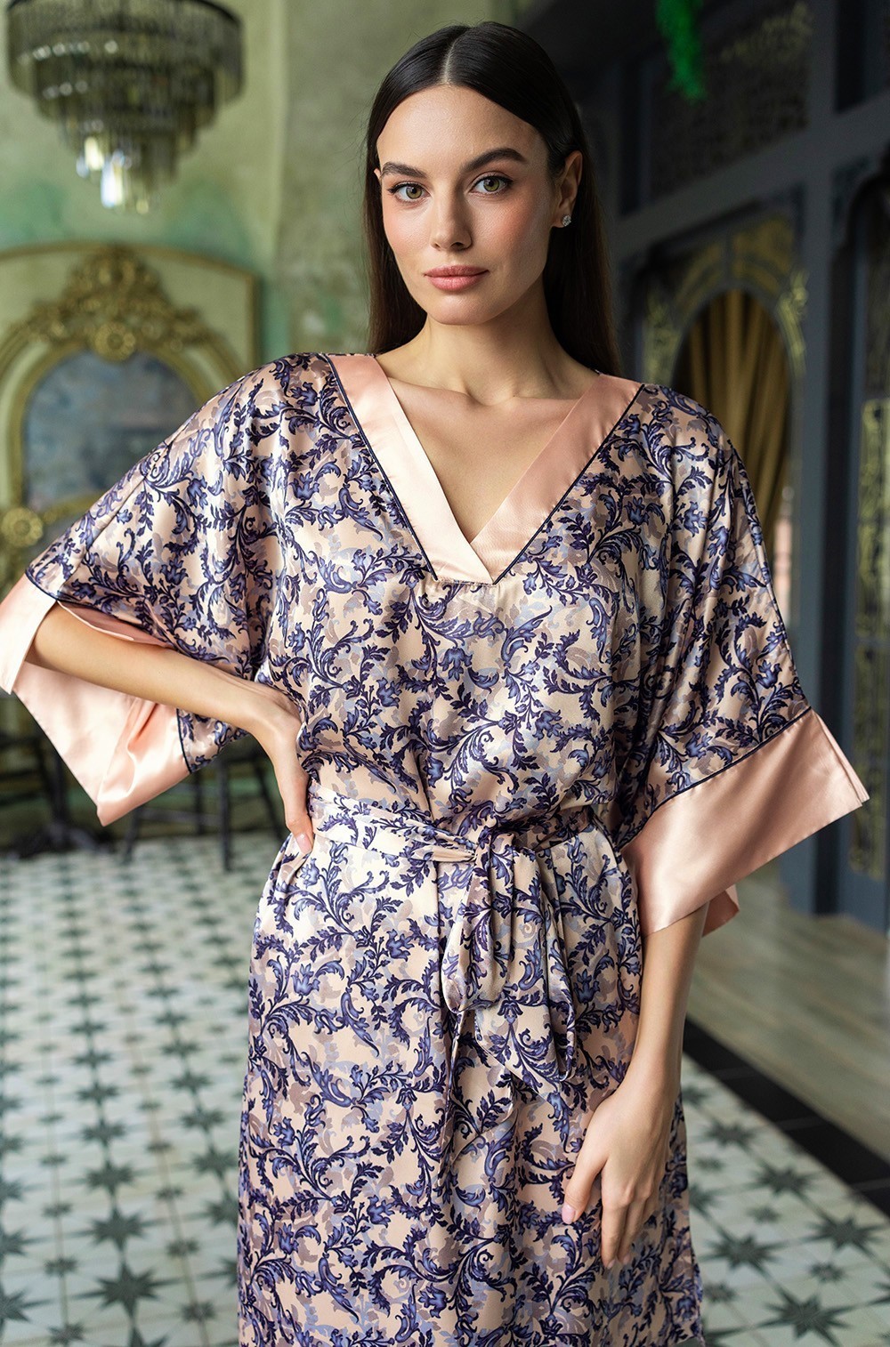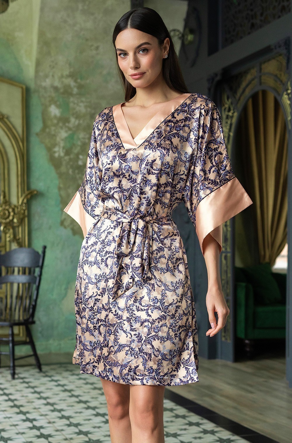Короткая туника Mia-Amore свободно силуэта с широким рукавом, которая выполнена из искусственного принтованного шелка с однотонной отделкой и контрастными кантами. В боковых швах туники расположены карманы, по низу обработаны разрезы. Линию талии можно подчеркнуть за счет пояса, который идет в комплекте.