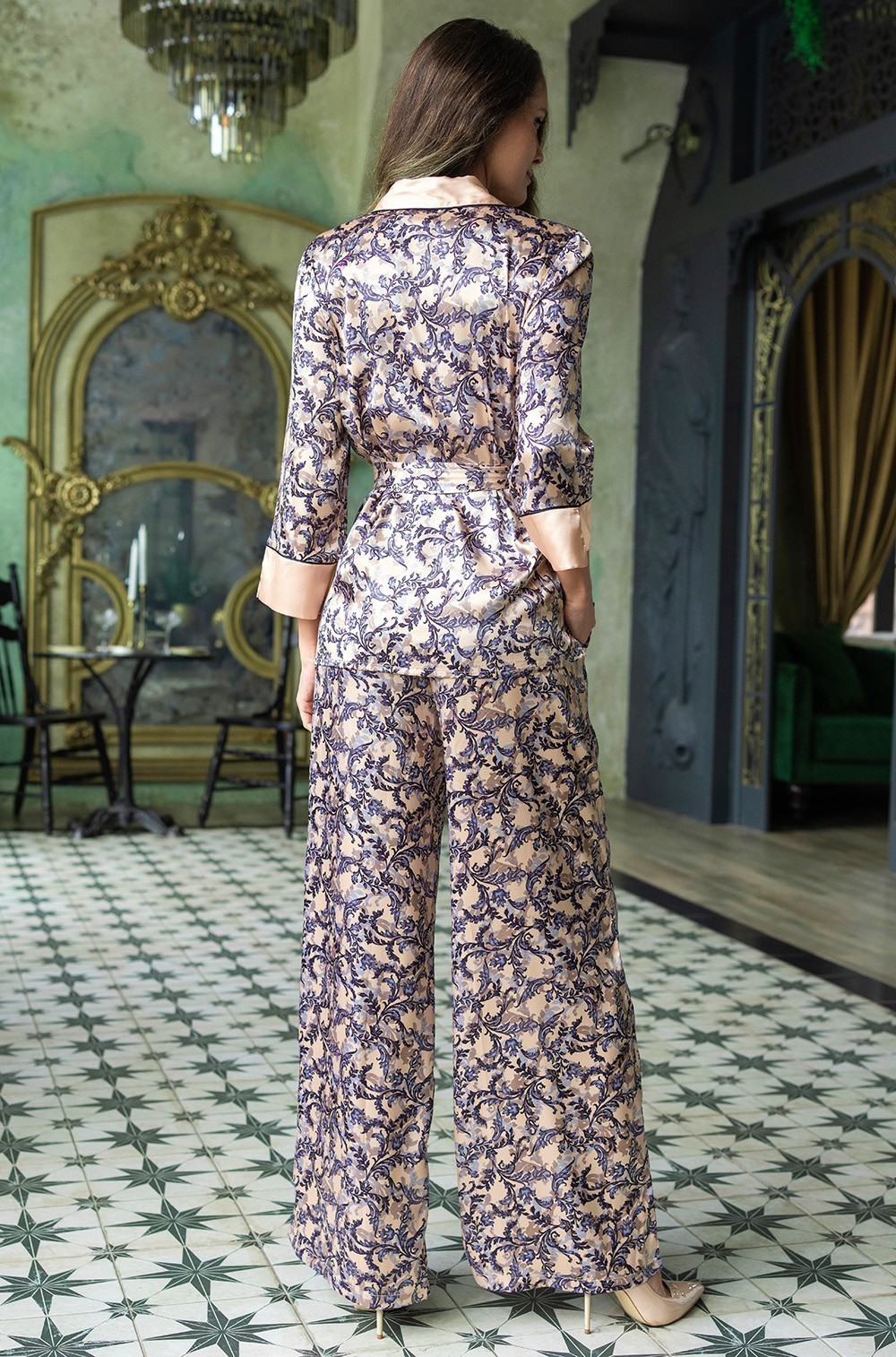 Комплект Mia-Amore состоит из жакета длинным рукавом и широких брюк. Комплект выполнен из искусственного принтованного шелка с однотонной отделкой и контрастными кантами. По бокам брюк расположены карманы. Линию талии можно подчеркнуть за счет пояса, который идет в комплекте.