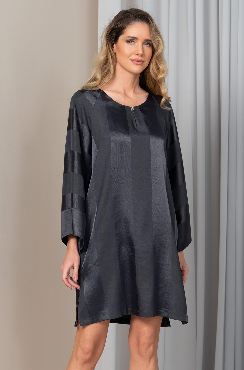 Короткая туника Mia-Amore свободного силуэта с длинным широким рукавом. Изделие выполнено из однотонного искусственного шелка на жаккардовой основе в виде широких полос, которые расположены под разным углом на деталях кроя. В боковых швах изделия расположены карманы. Линию талии можно подчеркнуть за счет широкого пояса, который идет в комплекте.