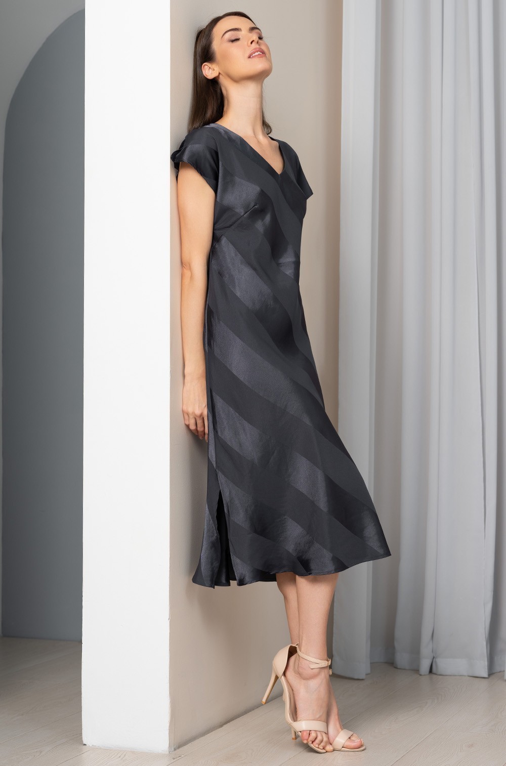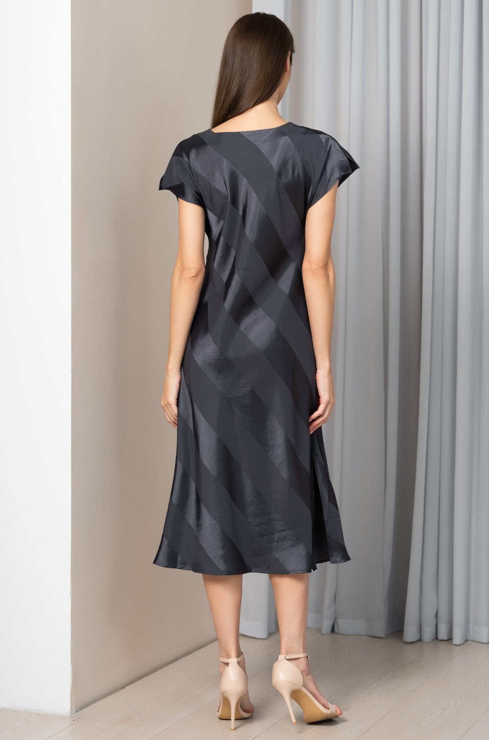 Длинное платье-туника Mia-Amore полуприлегающего силуэта с коротким рукавом и V-образным вырезом горловины. Изделие выполнено из однотонного искусственного шелка на жаккардовой основе в виде широких полос, которые расположены под углом 45°. По бокам расположены разрезы для свободы движения.