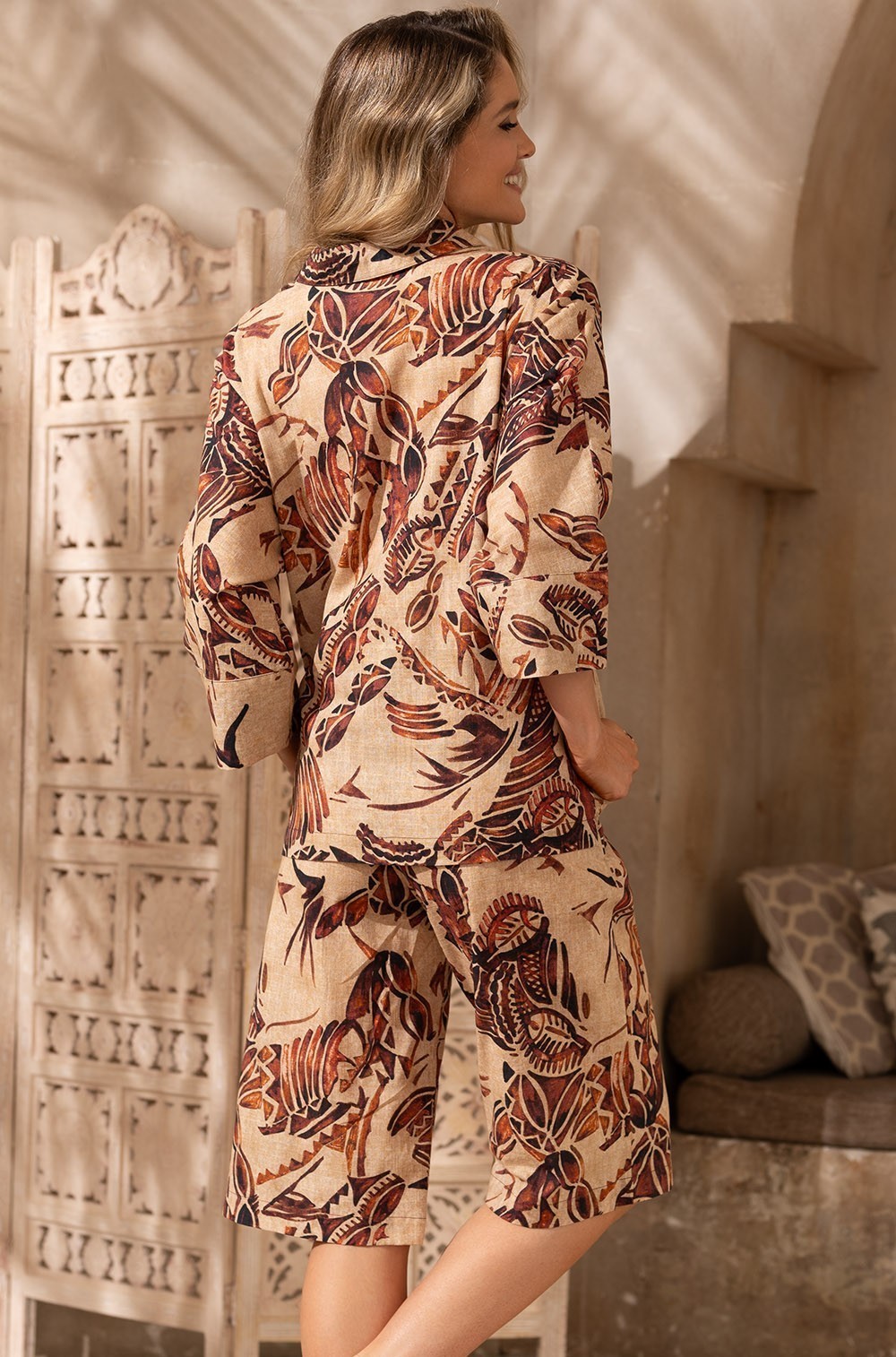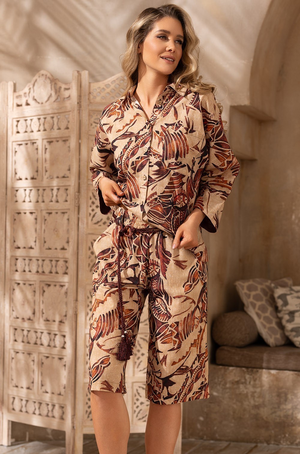 Комплект Mia-Amore состоит из рубашки свободного силуэта с рукавом длиной 3/4 и удлиненных шорт. Низ рукавов рубашки обработан манжетами, которые можно отвернуть и изменить длину рукава. По бокам шорт расположены карманы, а по низу боковых швов обработаны небольшие разрезы для свободы движения. Узкий пояс с кистями идет в комплекте. Комплект выполнен из принтованного смесового хлопка.