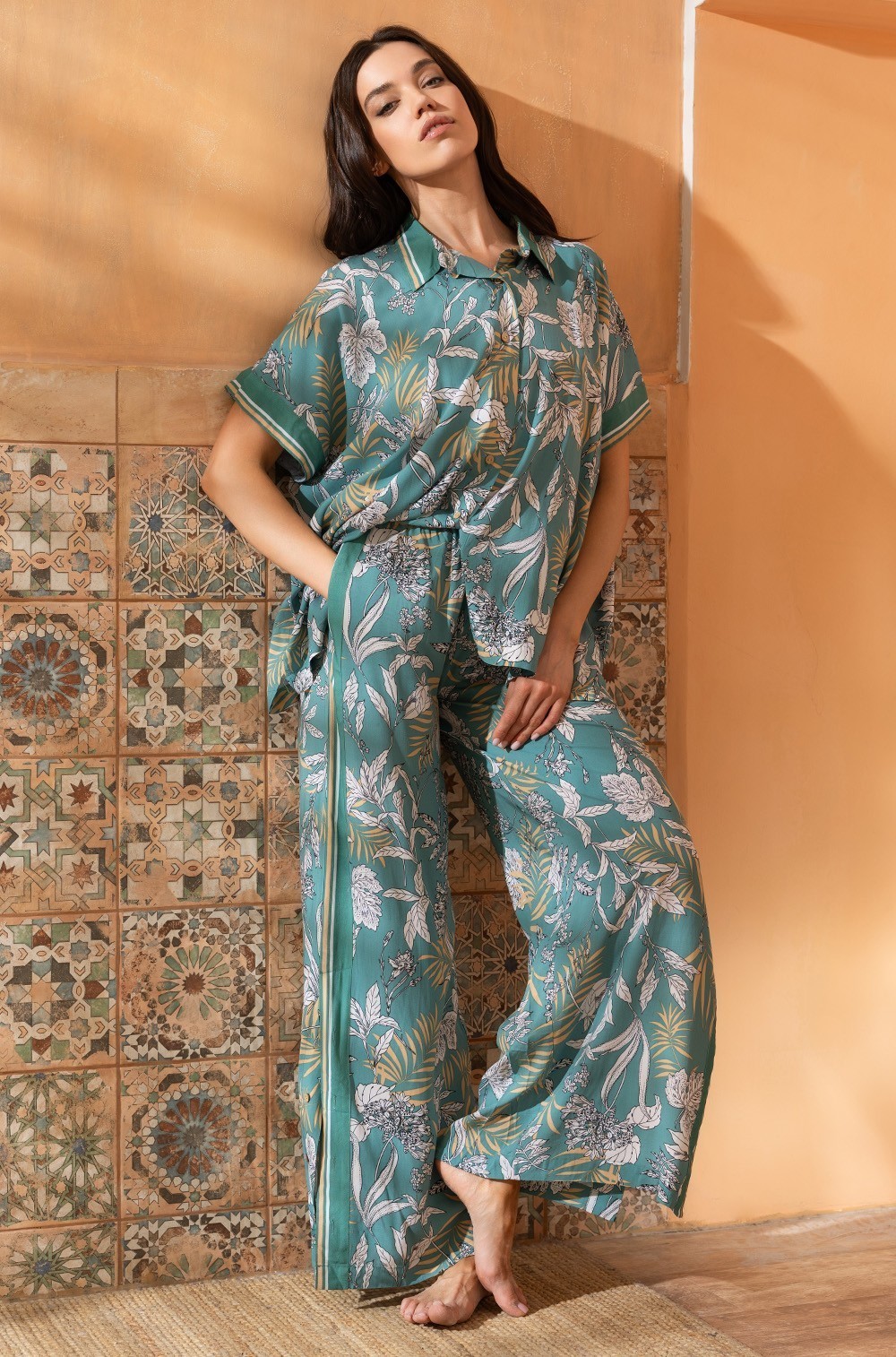 Комплект Mia-Amore состоит из блузки с застёжкой на пуговицы с цельнокроеными короткими рукавами и брюк свободного силуэта, выполнен из принтованного вискозного полотна. Рукава, воротник и боковые части брюк выполнены из полосатого компаньона.