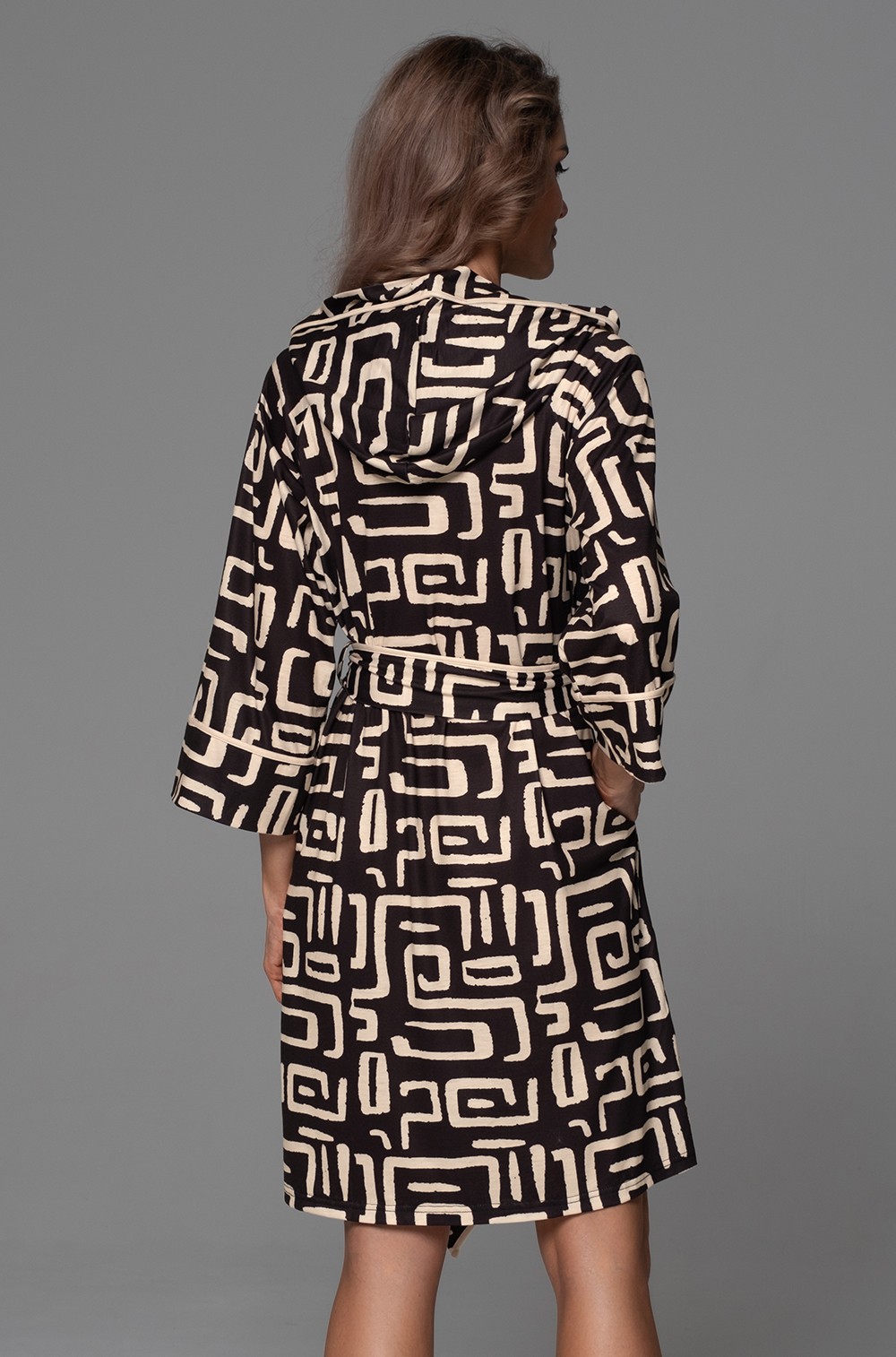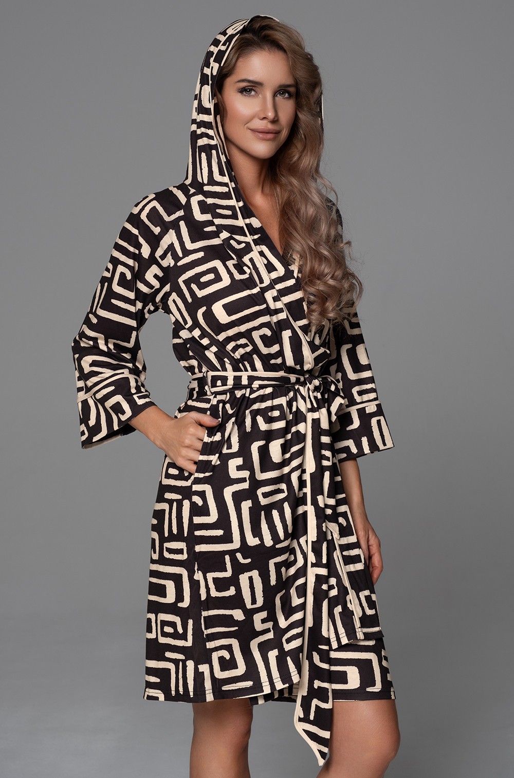 Короткий запашной халат Mia-Amore с рукавом длиной ¾. Халат выполнен из принтованного трикотажного полотна с однотонной отделкой. В боковых швах расположены карманы.