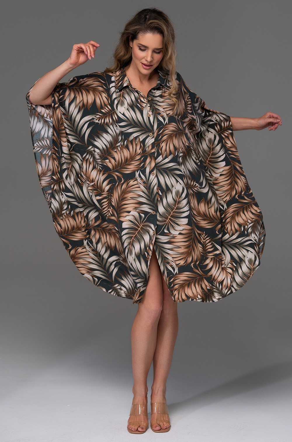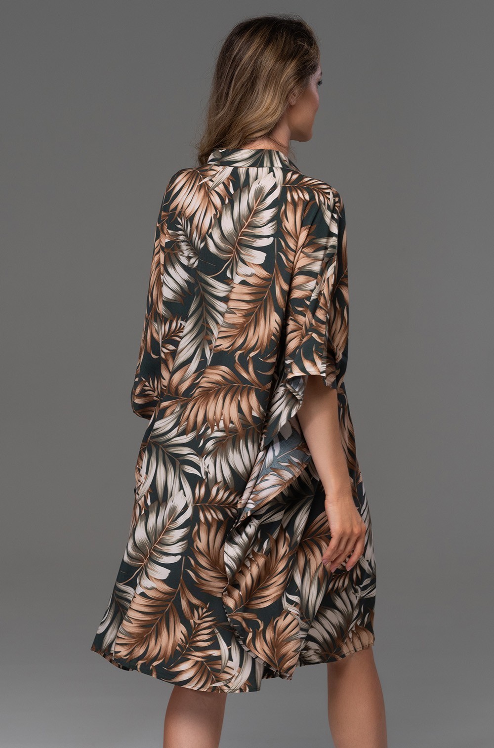 Короткая рубашка-туника Mia-Amore свободного силуэта и с удлиненной линией плеча, выполнена из принтованной вискозы. По центру изделия расположена застежка на кокосовые пуговицы.