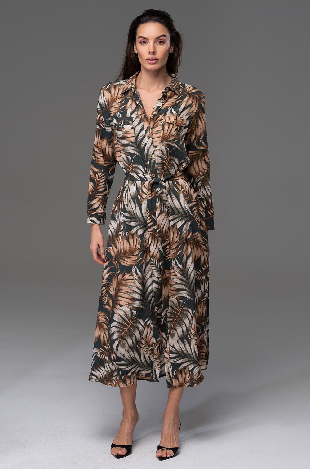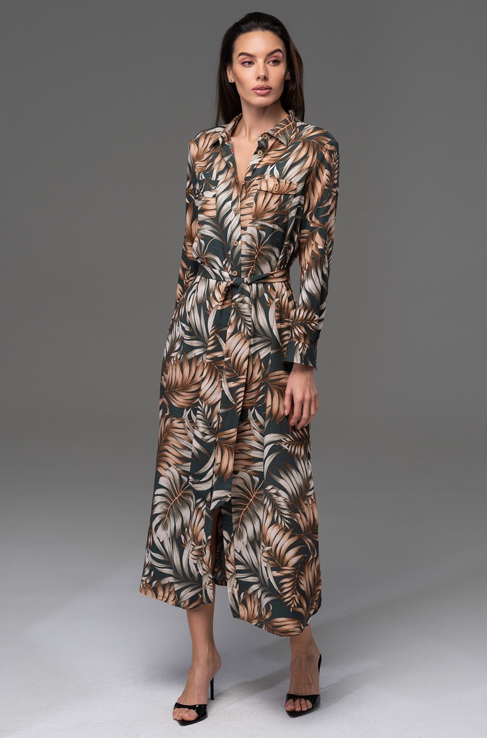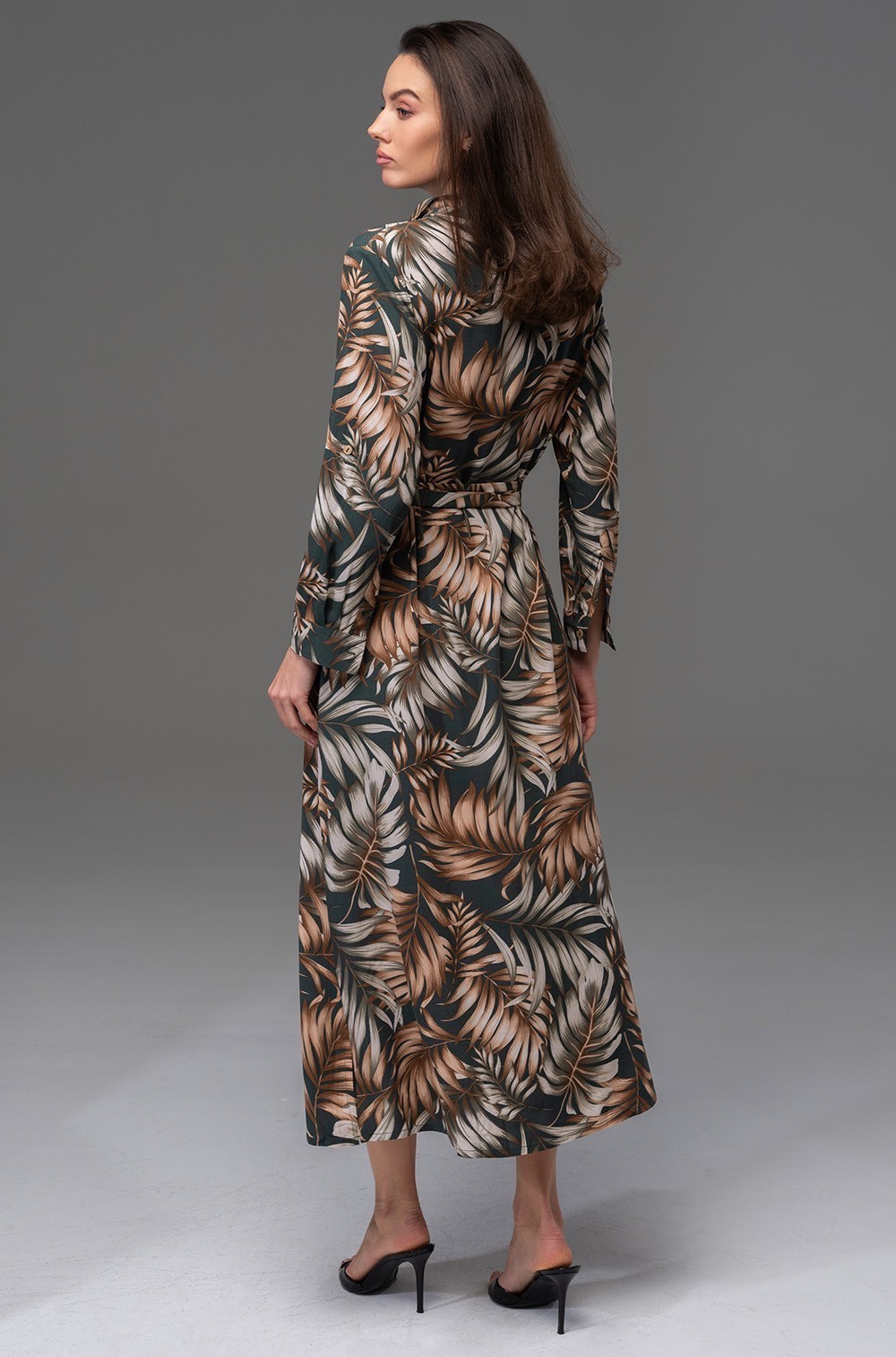 Длинная рубашка-платье Mia-Amore прямого силуэта из натуральной принтованной вискозы. Платье длиной до щиколотки, спереди застегивается на кокосовые пуговицы, на груди два накладных кармана с клапанами. Воротник отложной со стойкой. Длинные рукава подворачиваются и фиксируются хлястиком. В боковых швах карманы, внизу высокие разрезы. В комплект идет пояс, чтобы еще больше подчеркнуть женственный силуэт.
