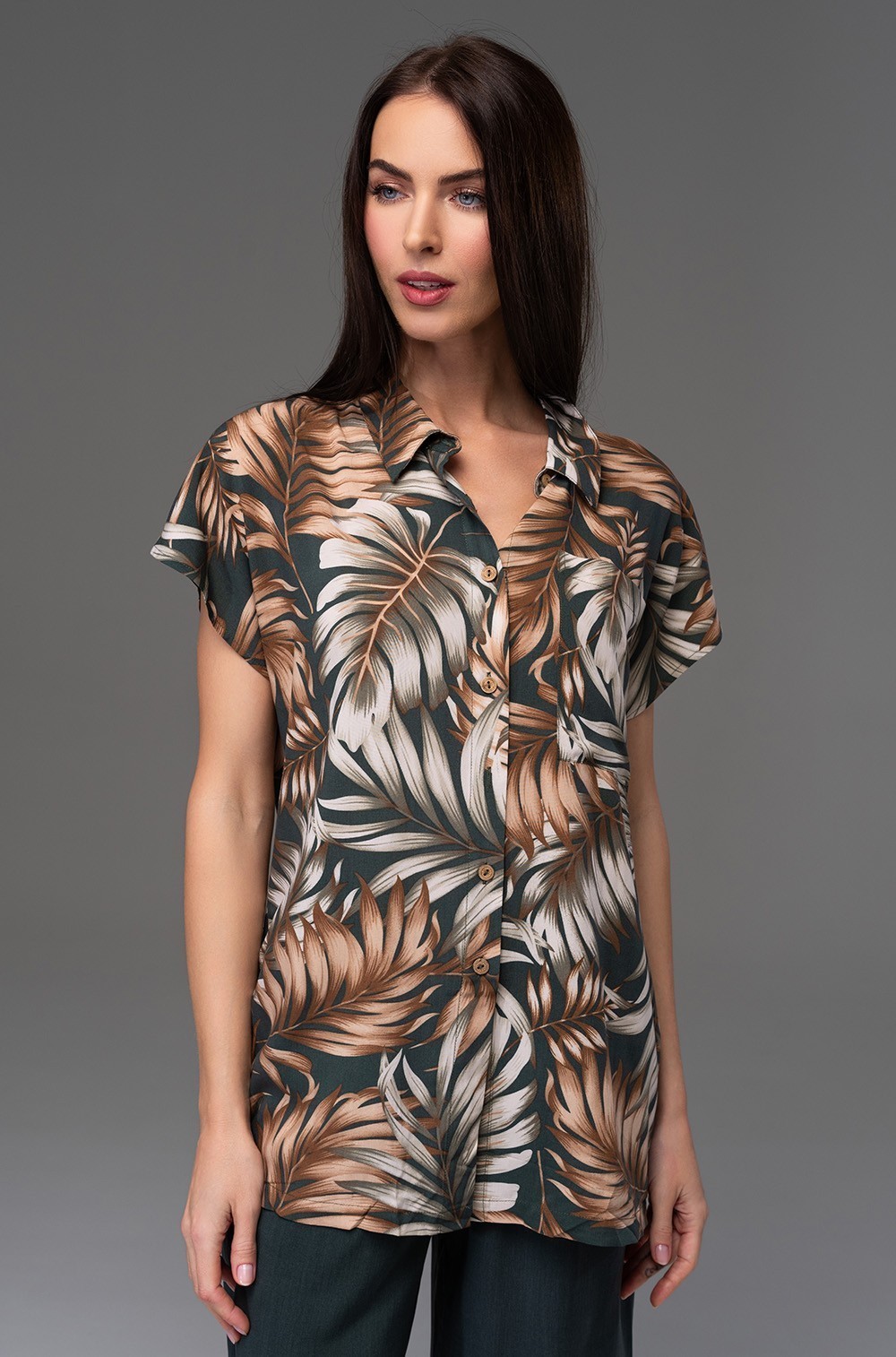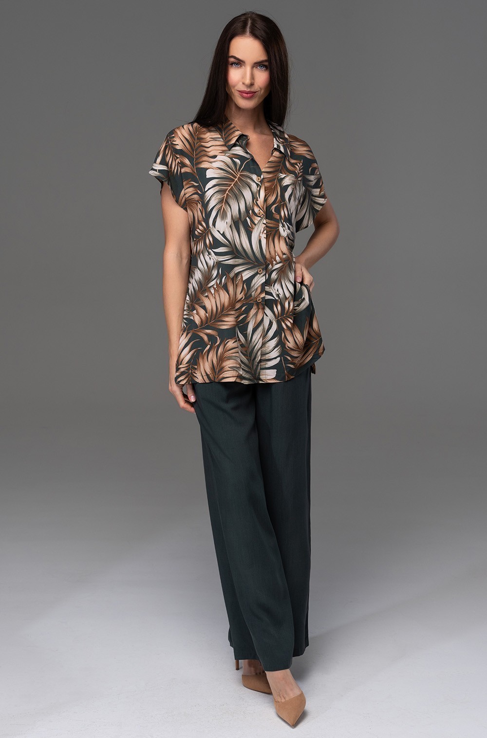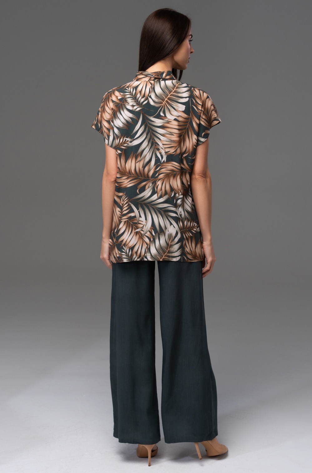 Комплект Mia-Amore состоит из жакета с коротким рукавом и широких брюк, жакет выполнен из принтованной вискозы, а брюки из однотонной. Жакет с застежкой на кокосовые пуговицы, по бокам жакета выполнены разрезы. По бокам брюк обработаны карманы.