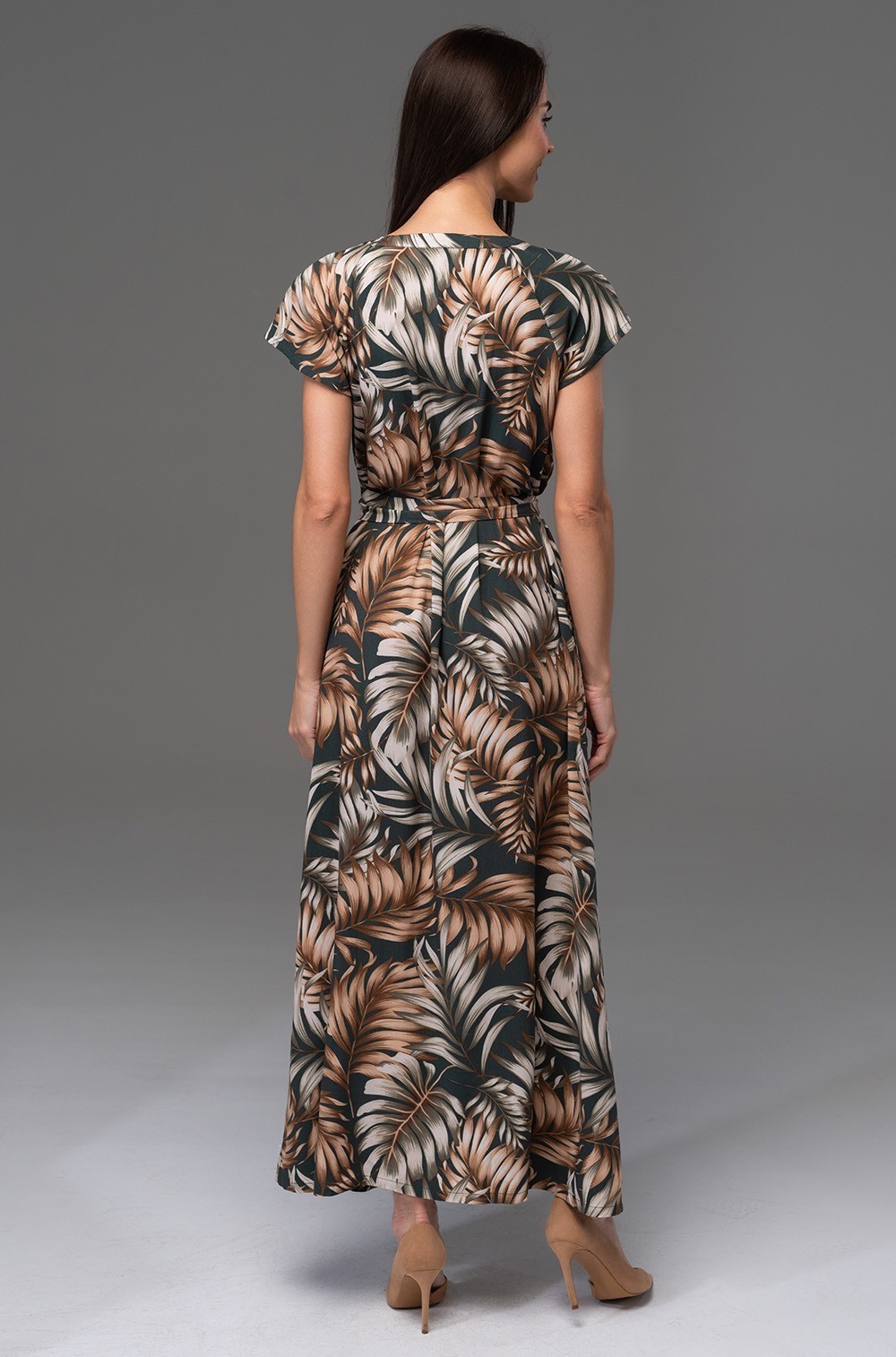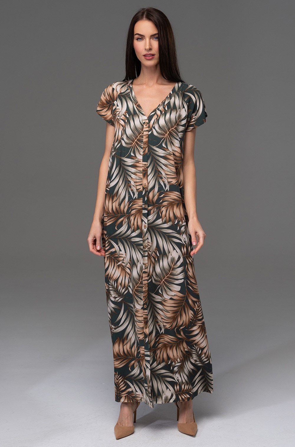 Удлиненное платье-рубашка Mia-Amore с центральной застежкой на кокосовые пуговицы и коротким рукавом, выполнено из принтованной вискозы. Линию талии можно подчеркнуть за счет пояса, который идет в комплекте.