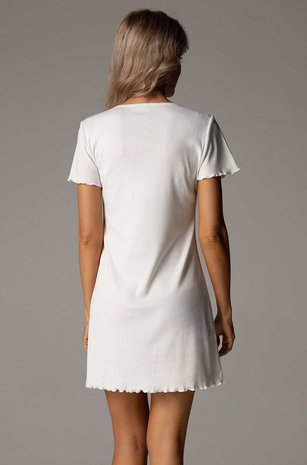 Короткая сорочка Mia-Amore с короткими рукавчиками выполнена из ажурного однотонного трикотажа «пуантель». Низ рукавов и низ сорочки украшены волнистым роликовым швом.