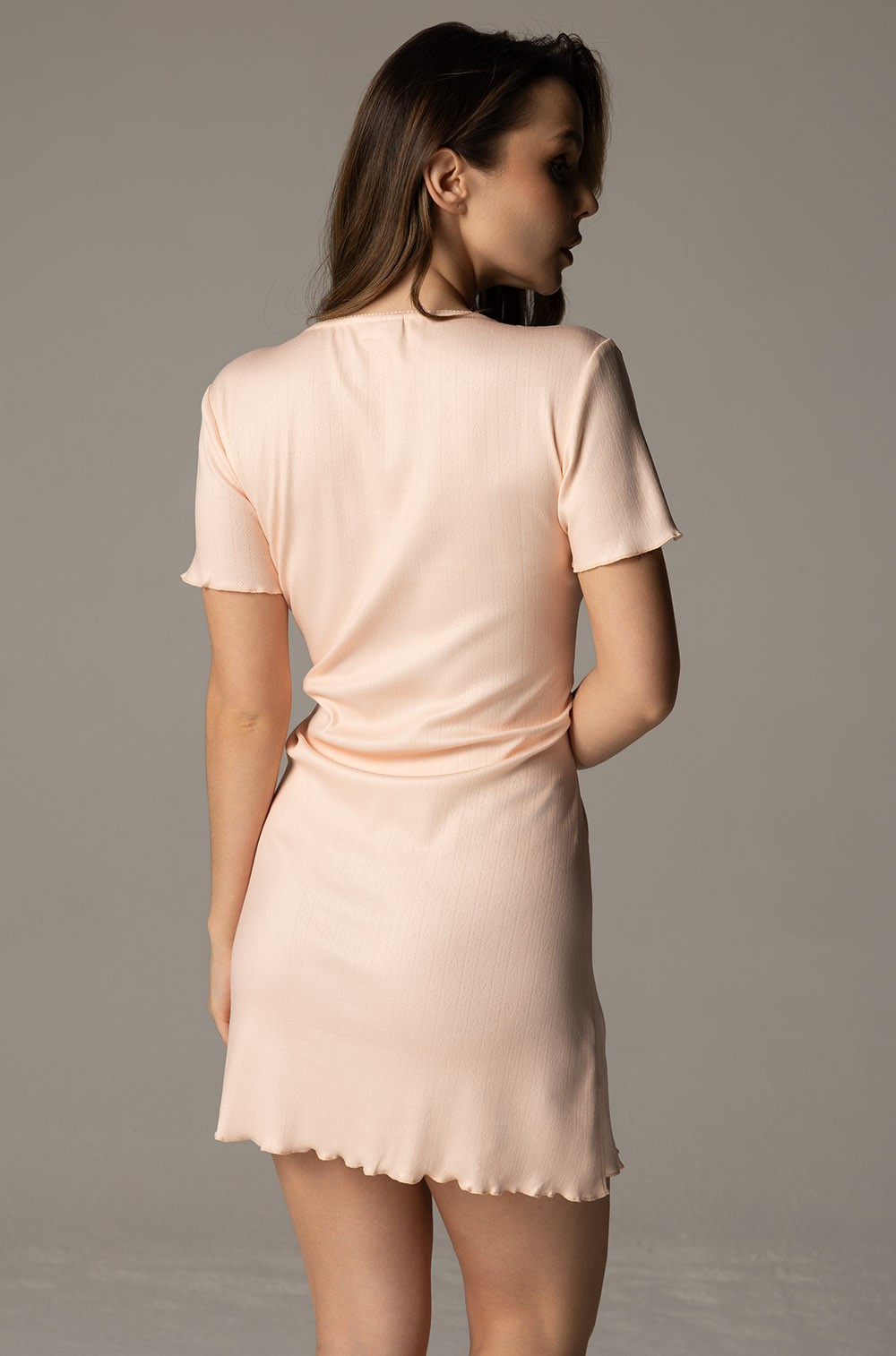 Короткая сорочка Mia-Amore с короткими рукавчиками выполнена из ажурного однотонного трикотажа «пуантель». Низ рукавов и низ сорочки украшены волнистым роликовым швом.