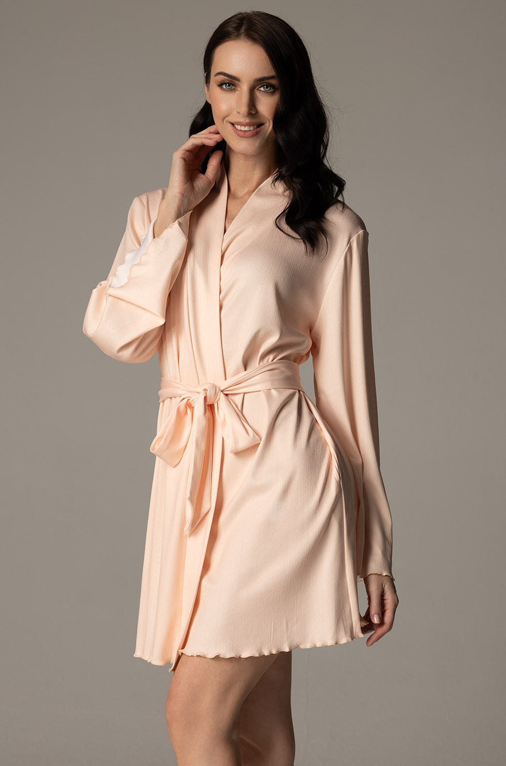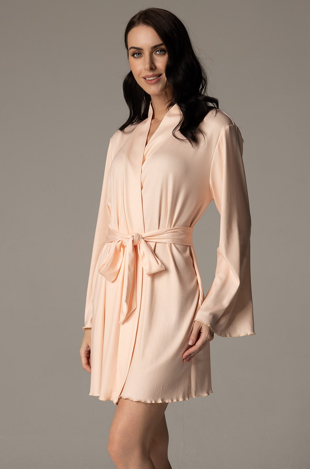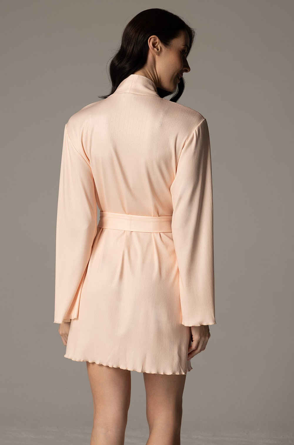 Короткий запашной халат Mia-Amore с длинными рукавами выполнен из ажурного однотонного трикотажа «пуантель». По низу рукава украшены волнистым роликовым швом. Халат комплектуется поясом, в боковых швах карманы.