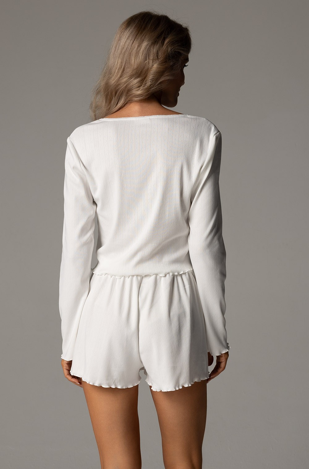 Комплект Mia-Amore состоит из короткого лонгслива с центральной застежкой на пуговки и шорт. Комплект выполнен из ажурного однотонного трикотажа «пуантель». Низ шорт, рукава и лонгслив по низу украшены волнистым роликовым швом.