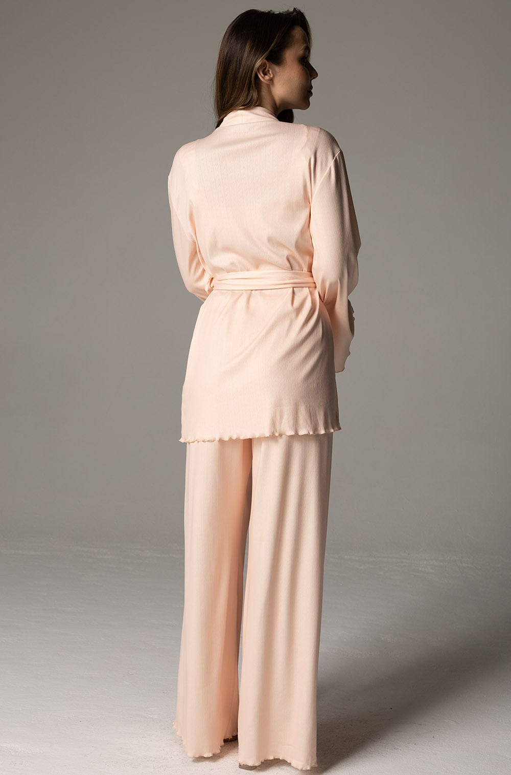 Комплект-тройка Mia-Amore состоит из кроп-топа, брюк свободного силуэта и запашного жакета. Комплект выполнен из ажурного однотонного трикотажа «пуантель». Кроп-топ имеет удобную посадку благодаря резинкам, которые образуют рюши по лифу и на бретелях. Низ брюк, рукава и низ жакета украшены волнистым роликовым швом. Жакет комплектуется поясом.