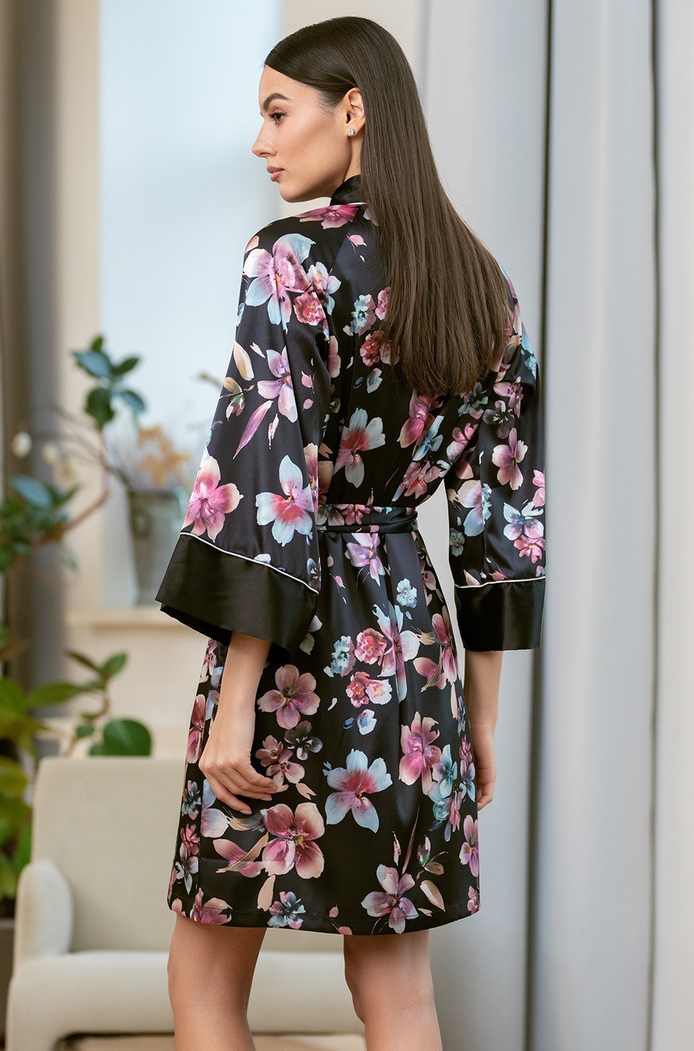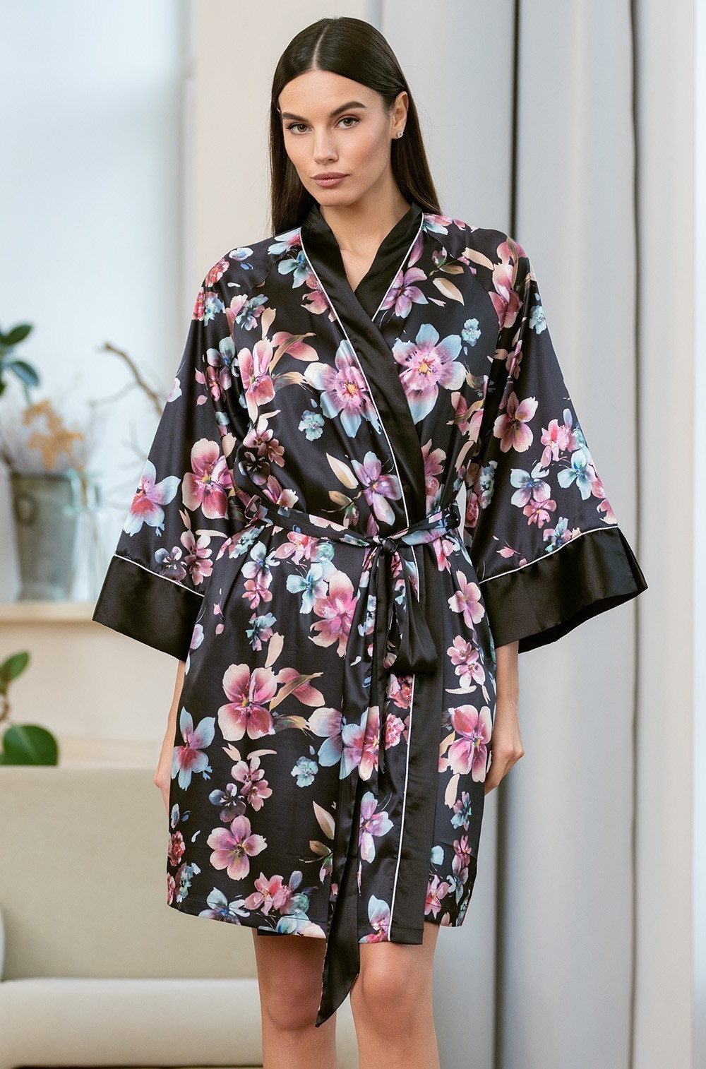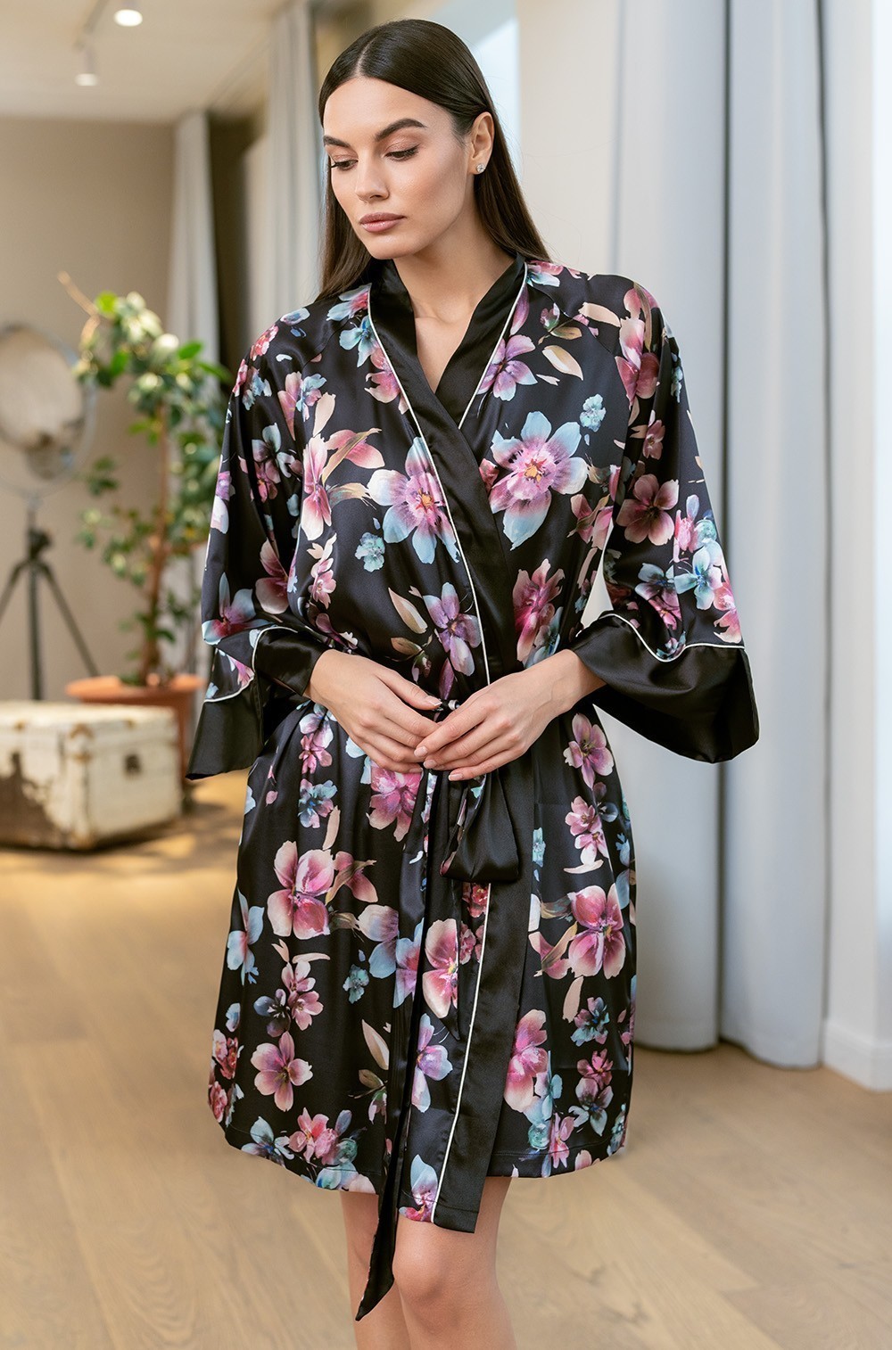 Короткий запашной халат Mia-Amore с широким рукавом длиной 3/4. Халат выполнен из принтованного смесового шелка с однотонной отделкой и контрастными кантами по бортам и низу рукавов. По бокам халата обработаны карманы.