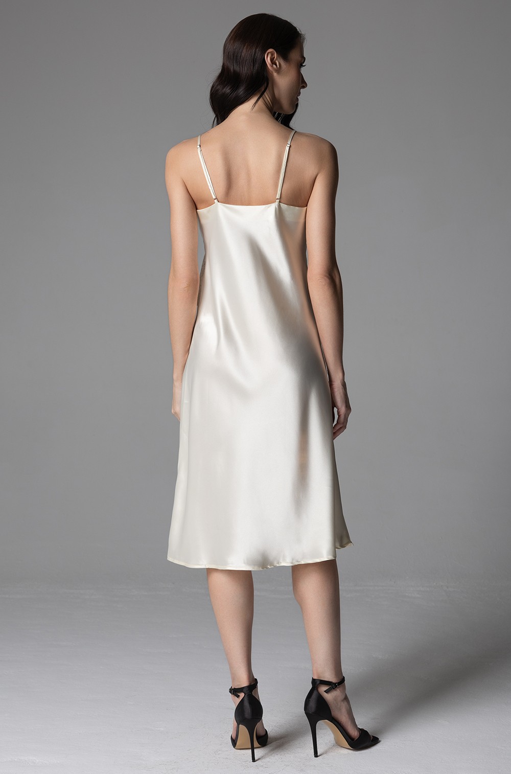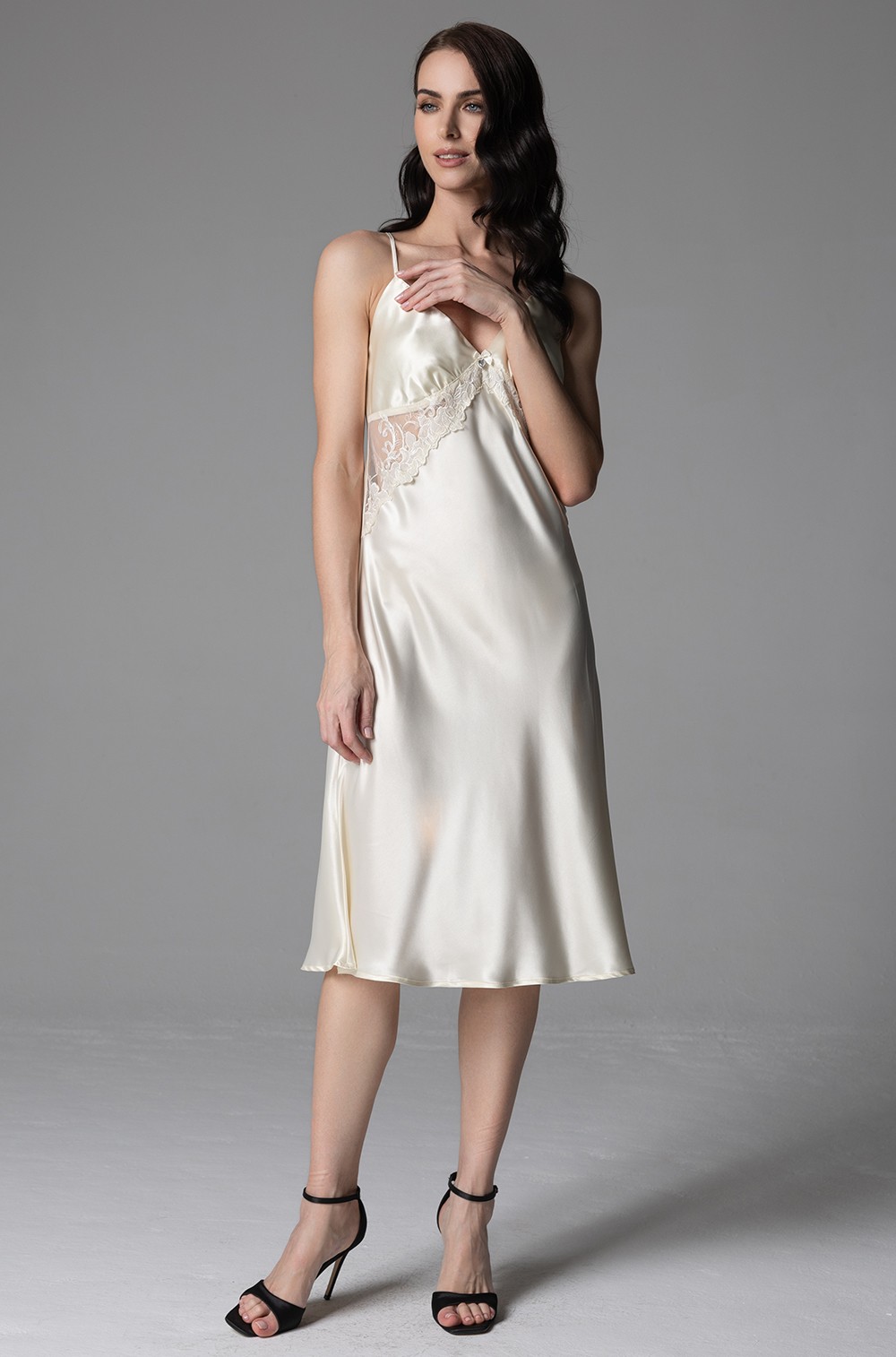 Сорочка Mia-Amore средней длины с подрезом на тонких регулируемых бретелях выполнена из однотонного смесового шёлка. Подрез сорочки выполнен с декором из вышивного кружева.