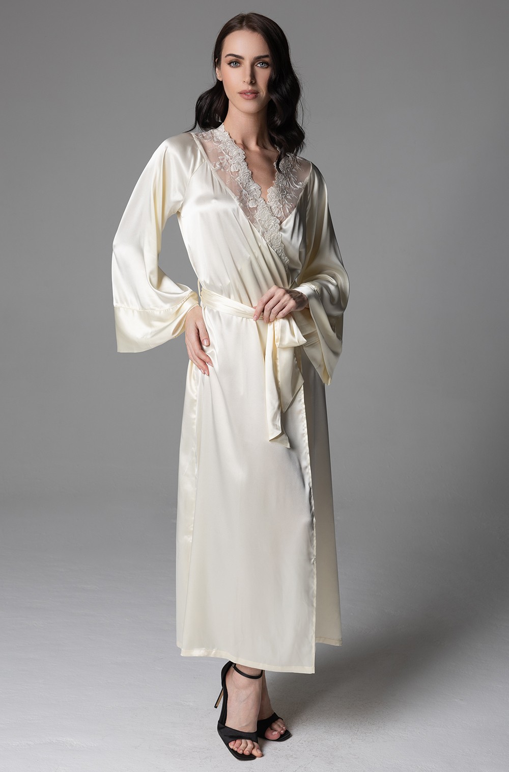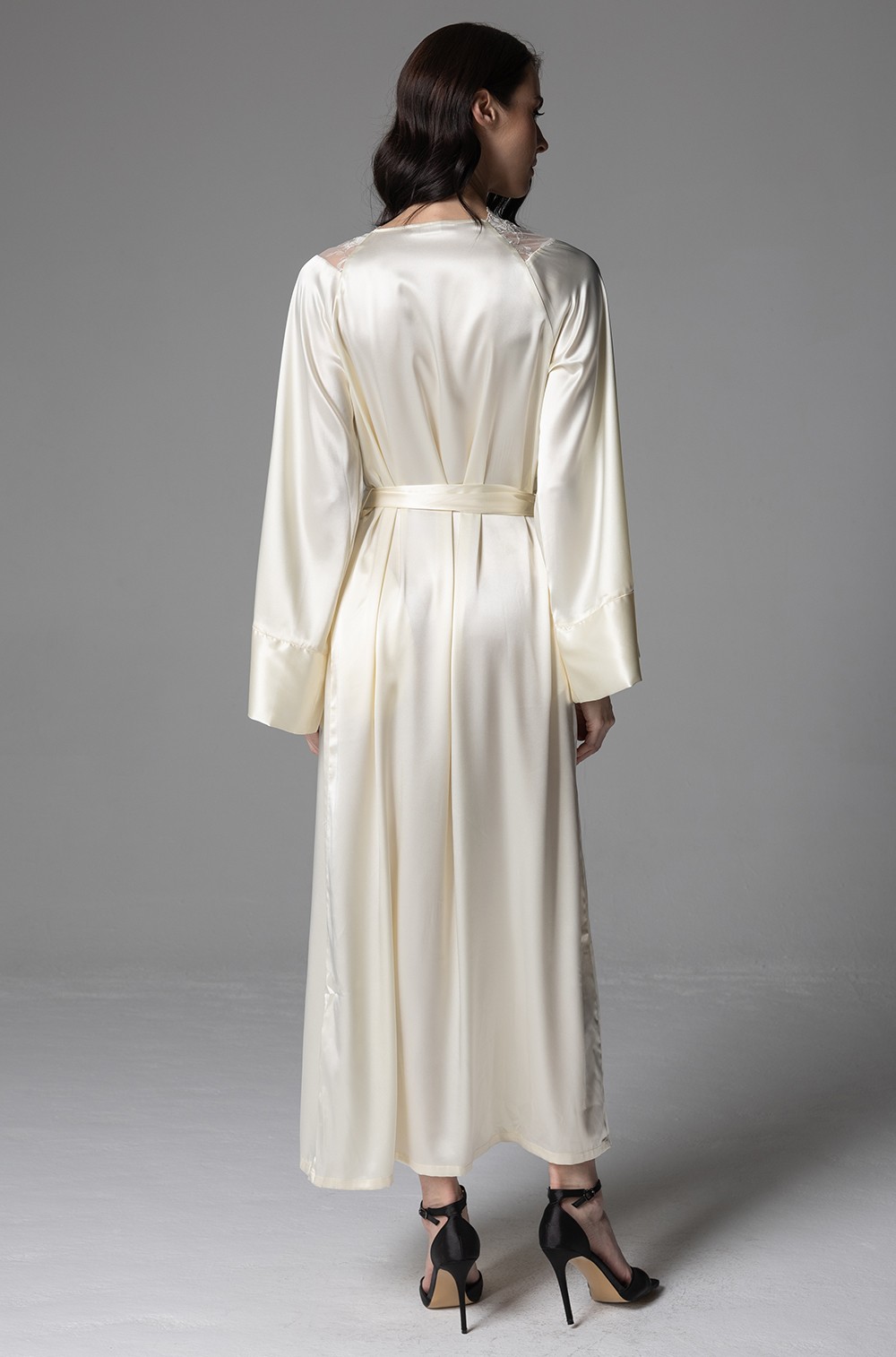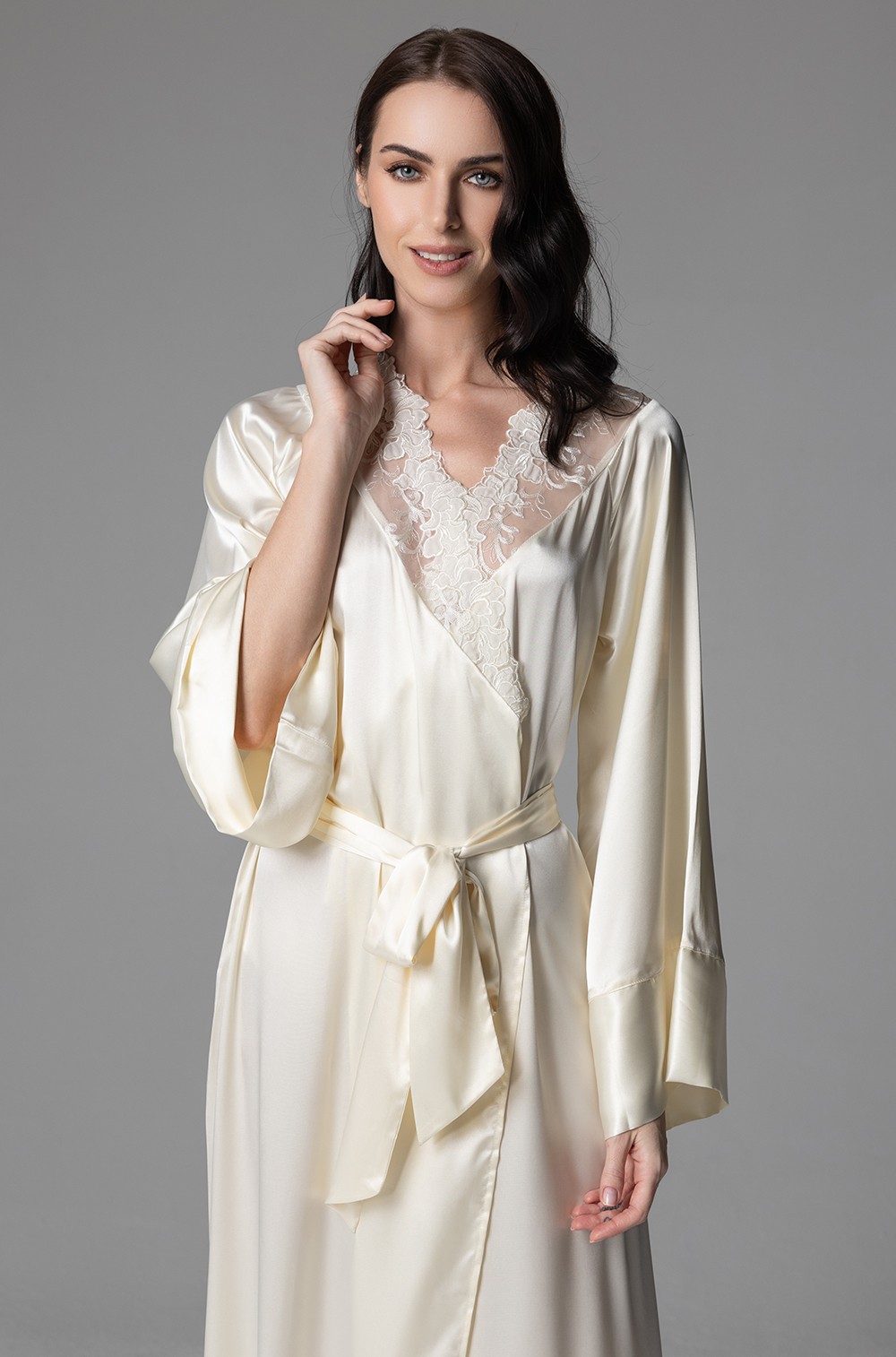 Длинный запашной халат Mia-Amore с длинными рукавами выполнен из однотонного смесового шёлка. Воротник декорирован вышивным кружевом. Халат комплектуется широким поясом, борт халата фиксируется при помощи пуговки, в боковых швах карманы.