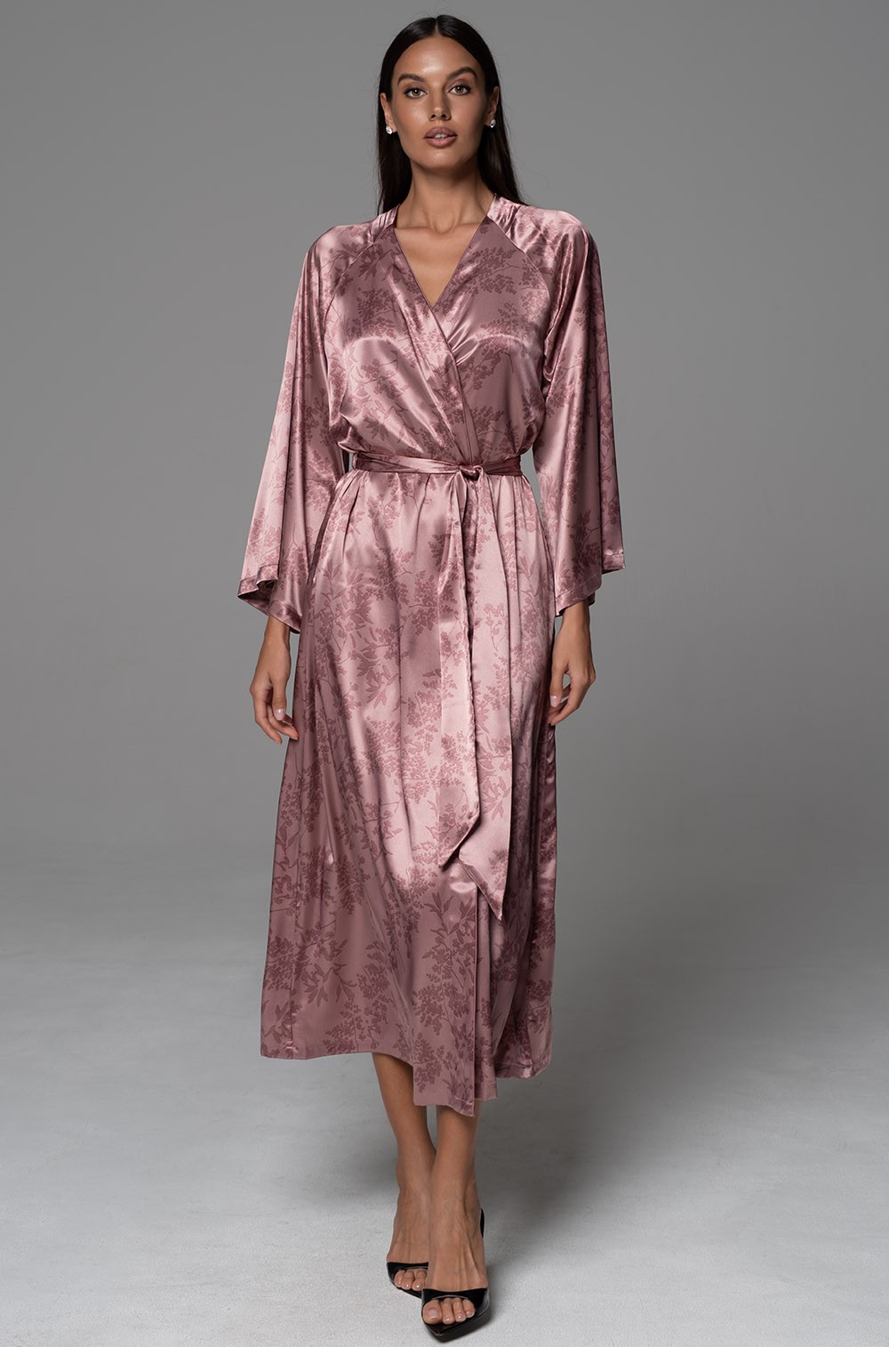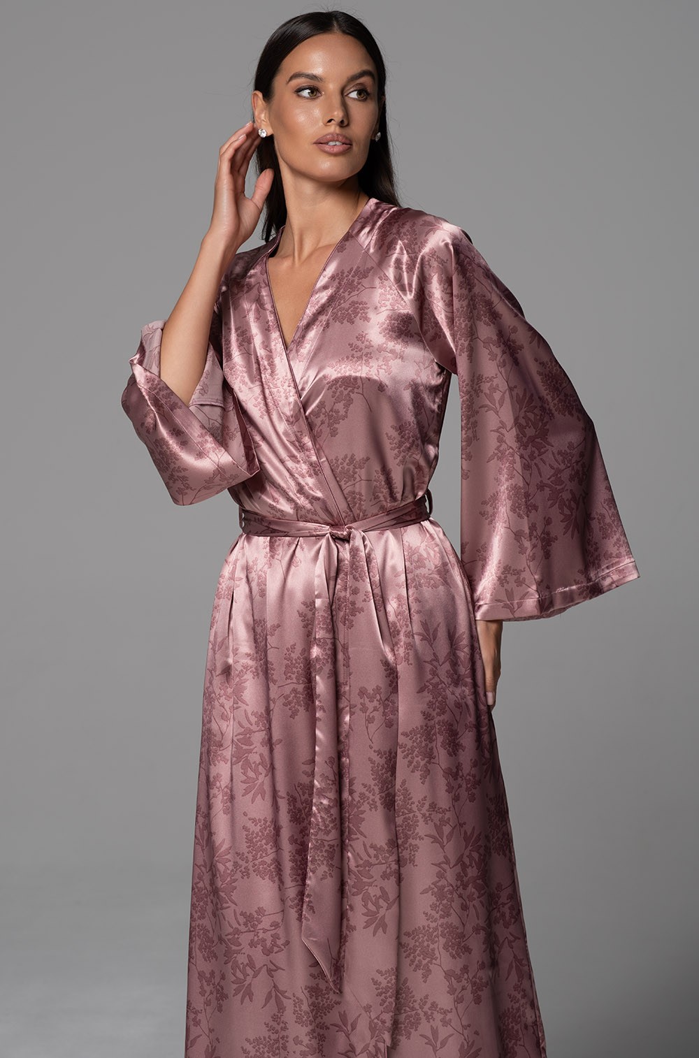 Длинный элегантный запашной халат Mia-Amore с широким длинным рукавом. Халат выполнен из принтованного смесового шелка. По бокам обработаны карманы.