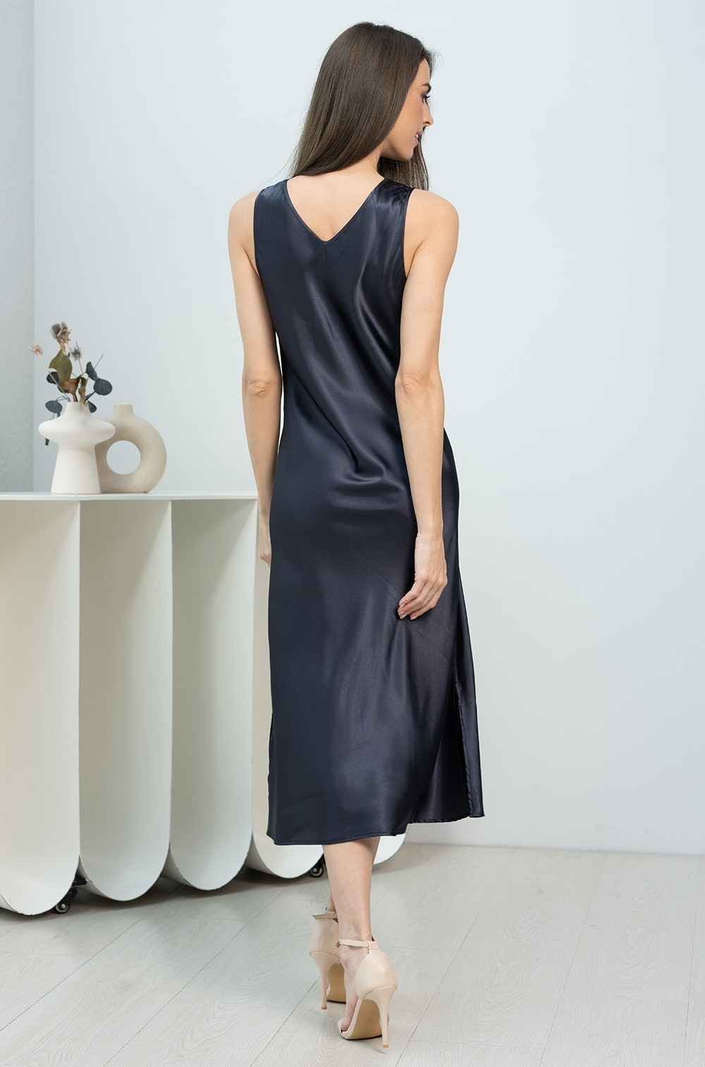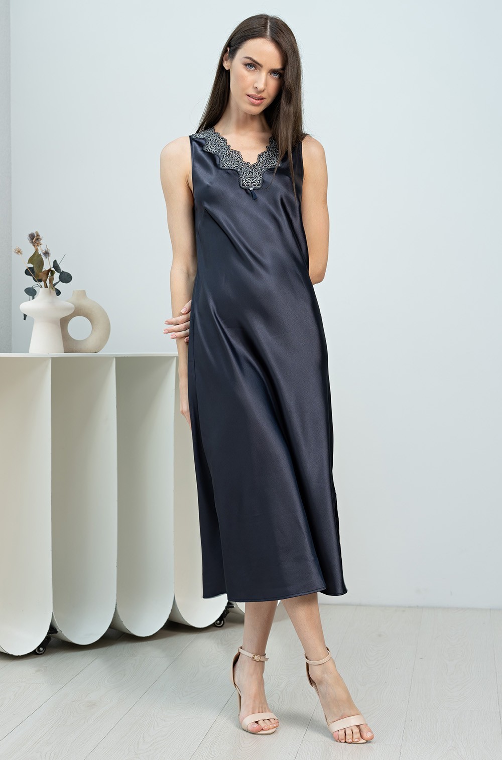 Женственная длинная сорочка Mia-Amore на широких бретелях. Изделие выполнено из однотонного смесового шелка. Вышивное двухцветное кружево украшает вырез сорочки. Декор - атласный бантик с подвеской, расположенный по вырезу сорочки. По бокам расположены разрезы для свободы движения.