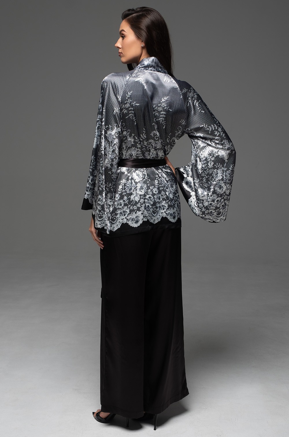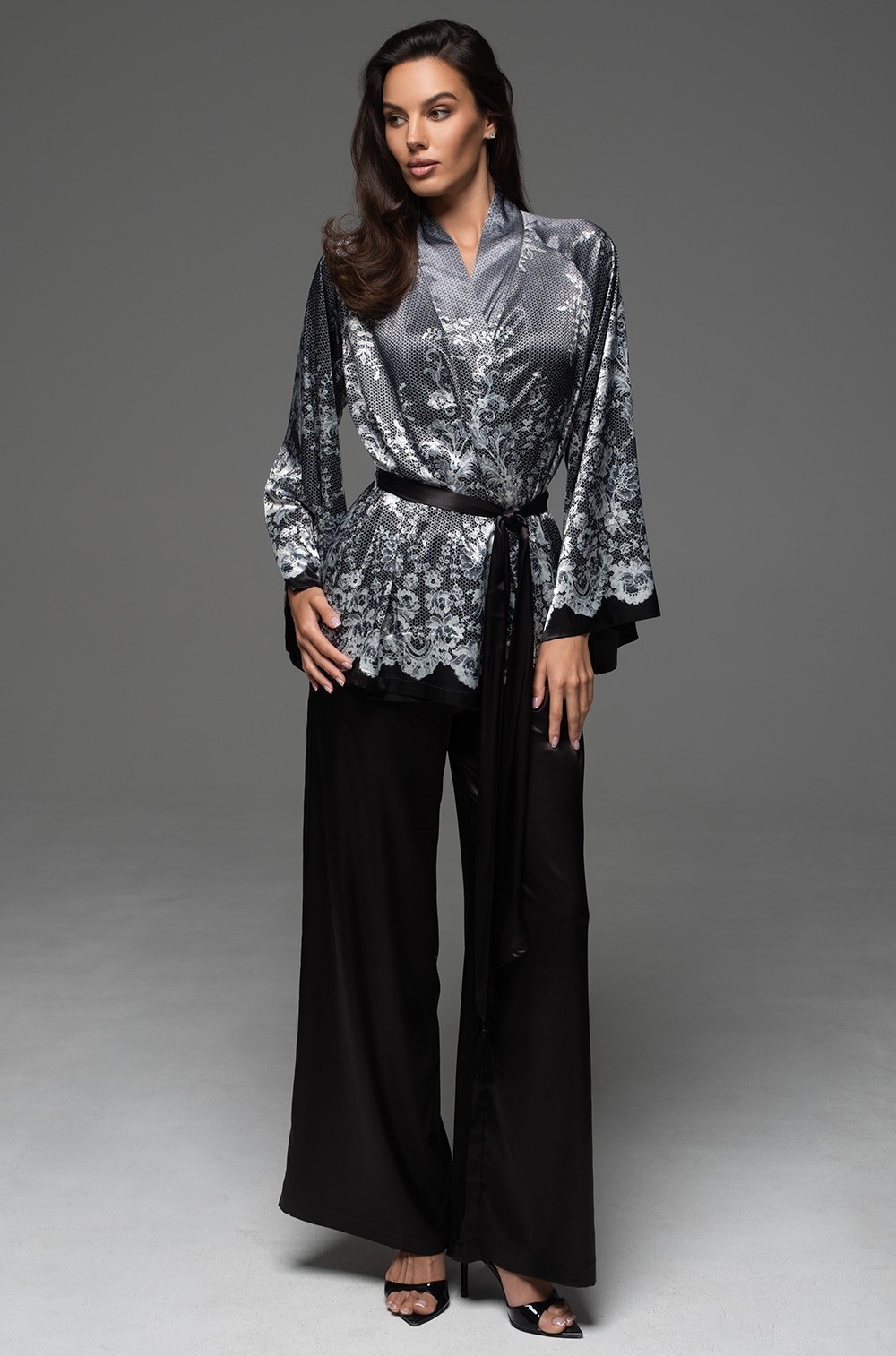 Комплект Mia-Amore состоит с запашного жакета и брюк-палаццо. Запашной жакет с широкими длинными рукавами выполнен из принтованного смесового шёлка, рукав и низ украшены кружевным купонным принтом. Брюки из однотонного смесового шёлка с эластичным поясом и с боковыми карманами. Халат комплектуется поясом с декоративными кисточками.