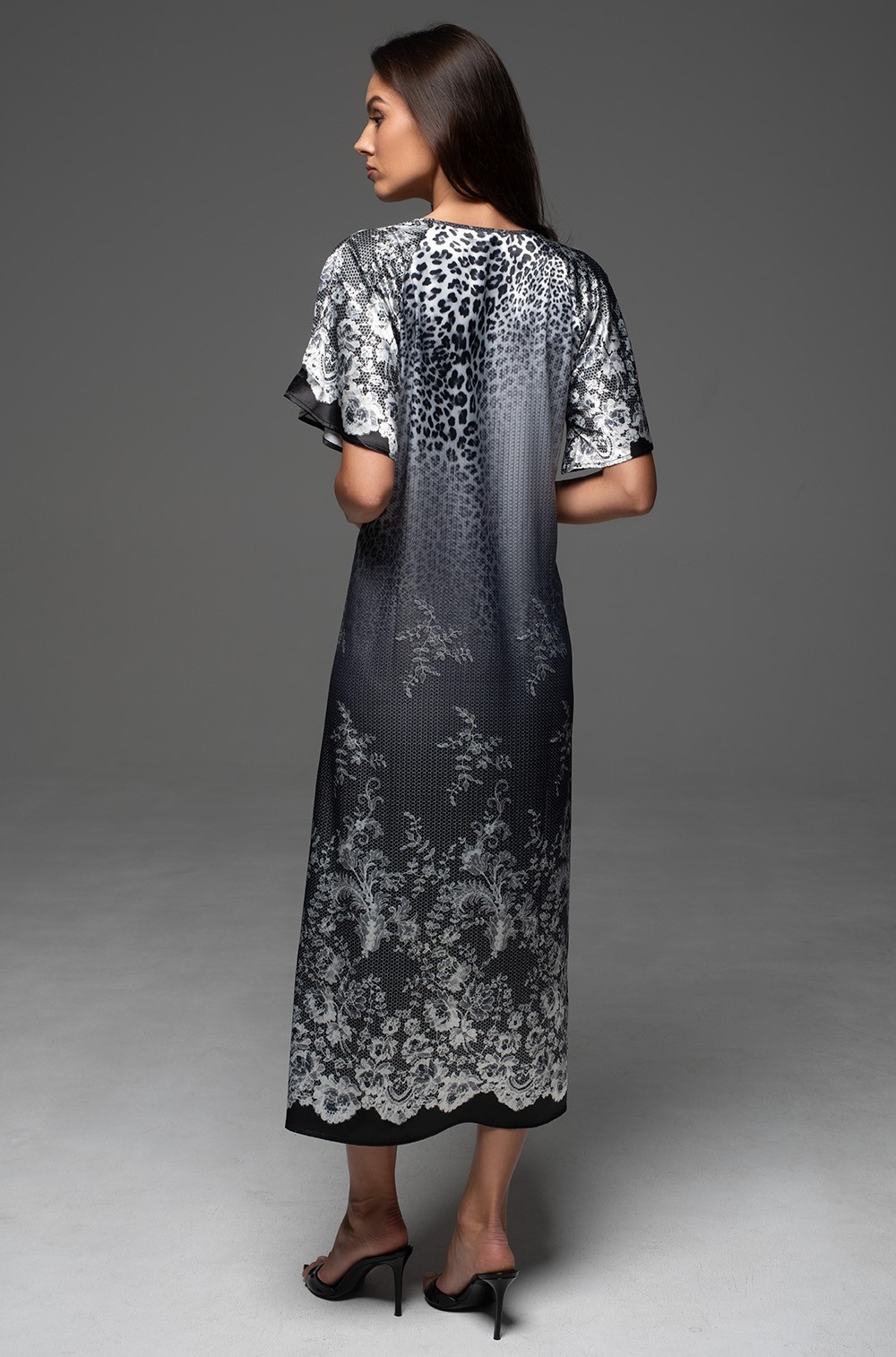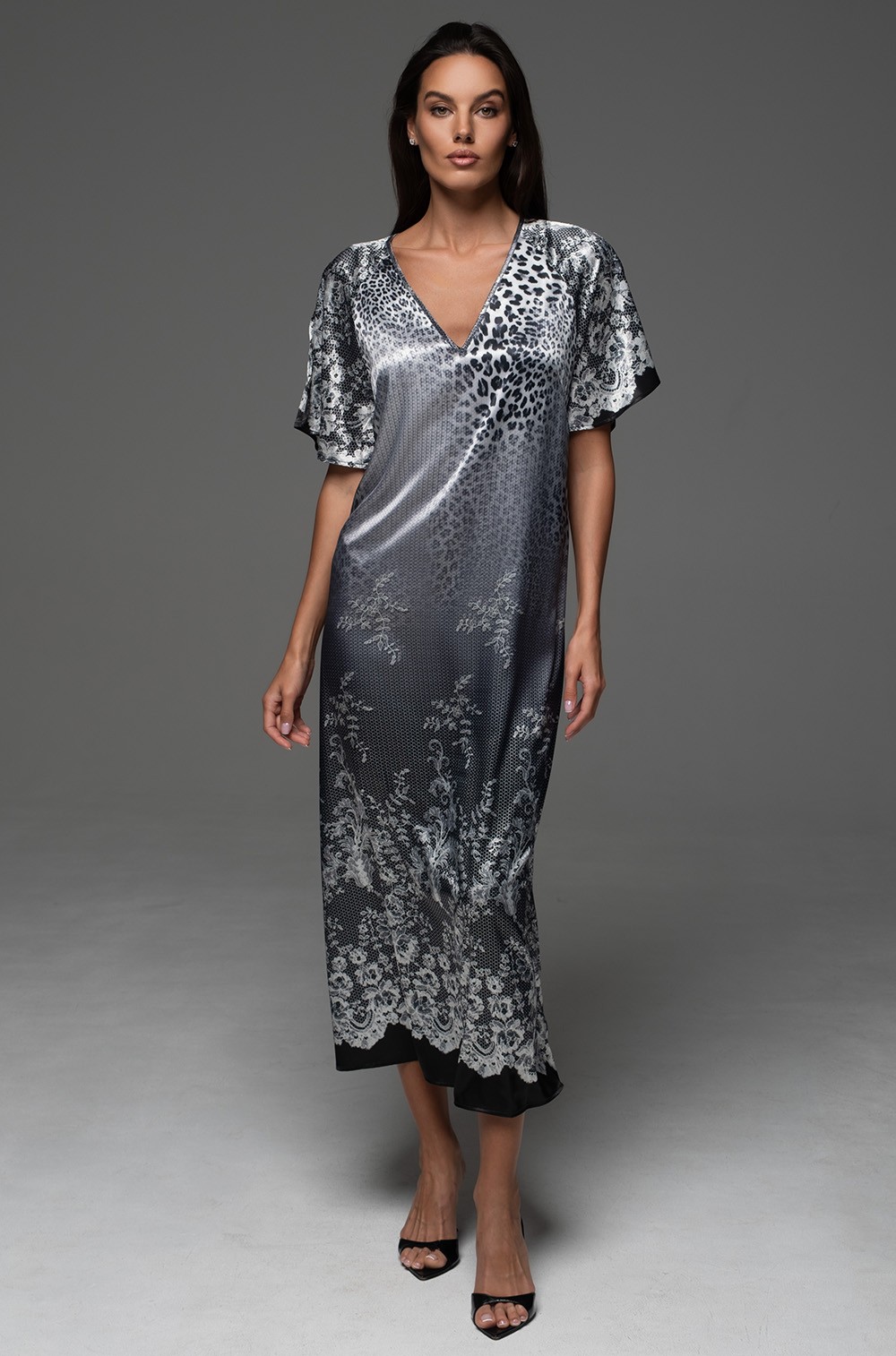 Длинная сорочка Mia-Amore с V-образным вырезом горловины и короткими рукавами выполнена из принтованного смесового шёлка с кружевным купоном по низу. Сбоку сорочки разрез.