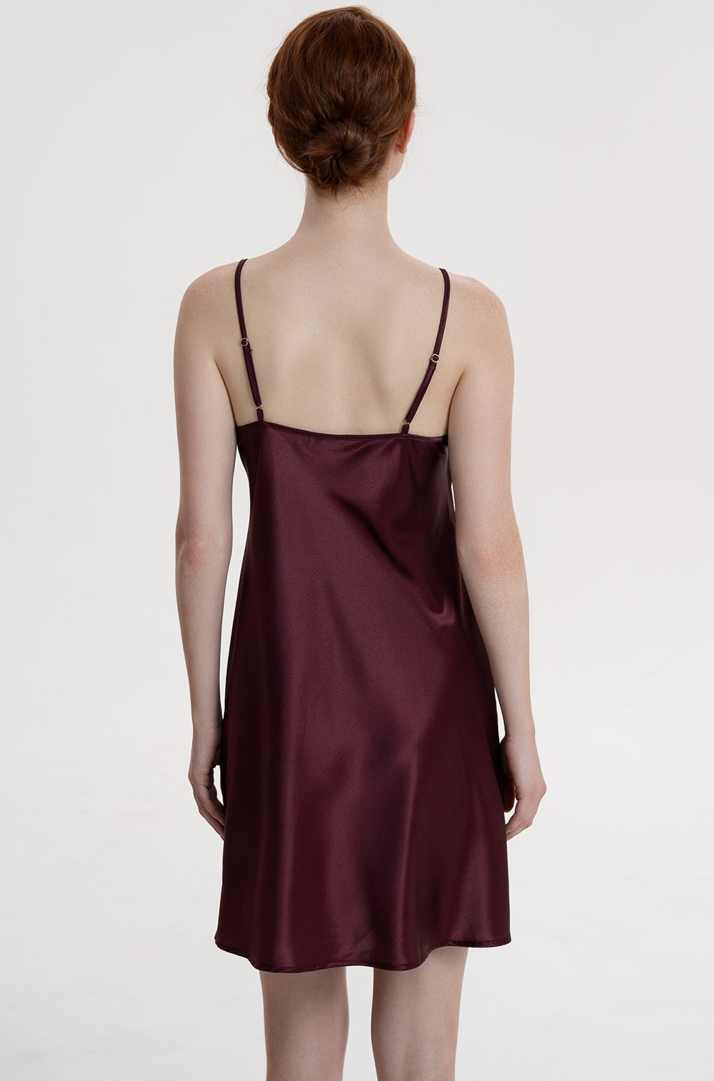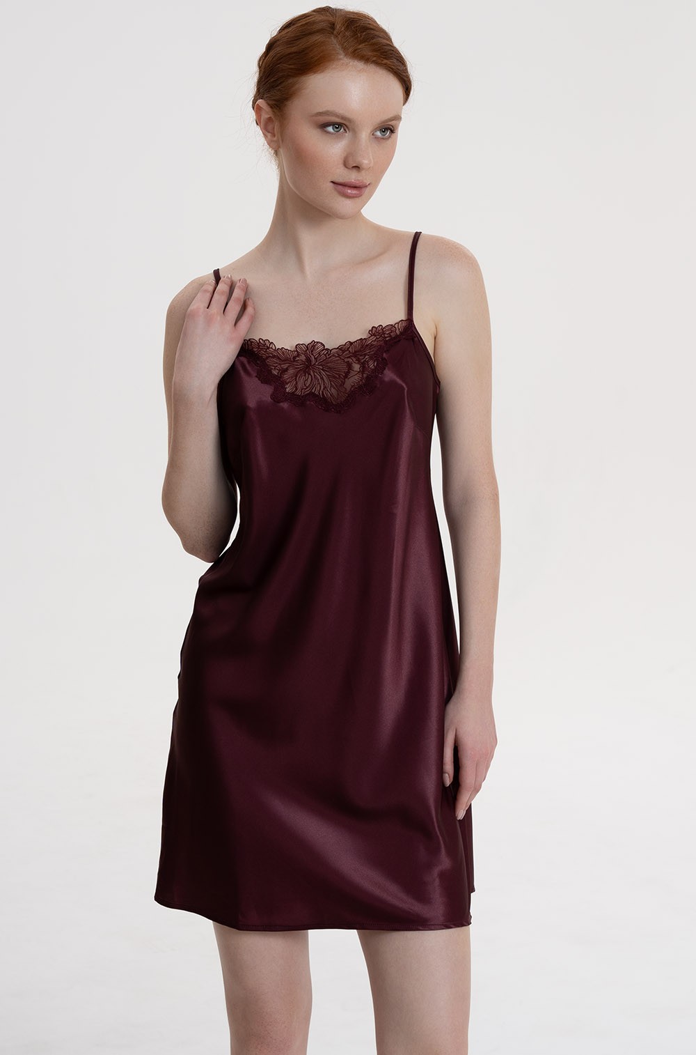 Короткая сорочка Mia-Amore на тонких регулируемых бретелях выполнена из однотонного смесового шёлка. По центру лифа сорочки ажурная вставка из вышитого мягкого кружева.